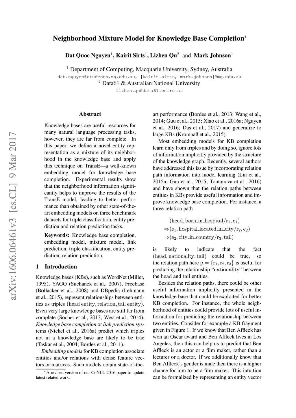 Knowledge bases are useful resources for many natural language processing tasks, however, they are far from complete. In this paper, we define a novel entity representation as a mixture of its neighborhood in the knowledge base and apply this technique on TransE-a well-known embedding model for knowledge base completion. Experimental results show that the neighborhood information significantly helps to improve the results of the TransE model, leading to better performance than obtained by other state-of-the-art embedding models on three benchmark datasets for triple classification, entity prediction and relation prediction tasks.