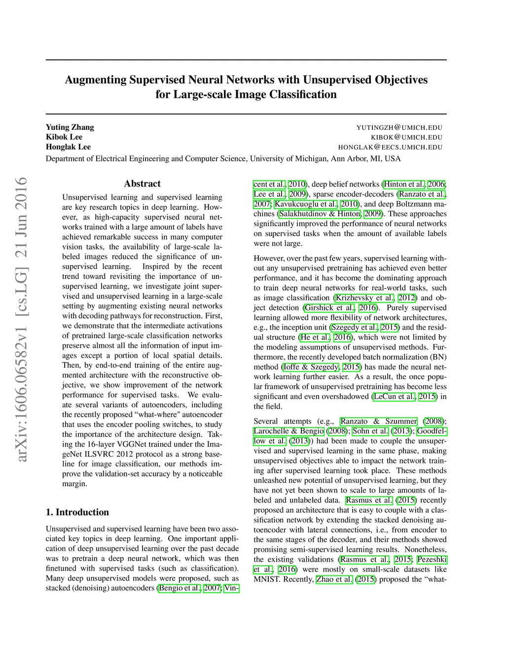 Unsupervised learning and supervised learning are key research topics in deep learning. However, as high-capacity supervised neural networks trained with a large amount of labels have achieved remarkable success in many computer vision tasks, the availability of large-scale labeled images reduced the significance of unsupervised learning. Inspired by the recent trend toward revisiting the importance of unsupervised learning, we investigate joint supervised and unsupervised learning in a large-scale setting by augmenting existing neural networks with decoding pathways for reconstruction. First, we demonstrate that the intermediate activations of pretrained large-scale classification networks preserve almost all the information of input images except a portion of local spatial details. Then, by end-to-end training of the entire augmented architecture with the reconstructive objective, we show improvement of the network performance for supervised tasks. We evaluate several variants of autoencoders, including the recently proposed "what-where" autoencoder that uses the encoder pooling switches, to study the importance of the architecture design. Taking the 16-layer VGGNet trained under the ImageNet ILSVRC 2012 protocol as a strong baseline for image classification, our methods improve the validation-set accuracy by a noticeable margin.