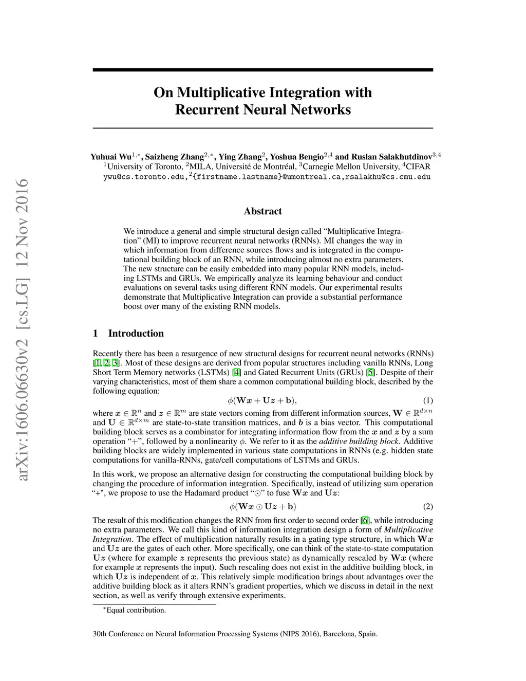 We introduce a general and simple structural design called Multiplicative Integration (MI) to improve recurrent neural networks (RNNs). MI changes the way in which information from difference sources flows and is integrated in the computational building block of an RNN, while introducing almost no extra parameters. The new structure can be easily embedded into many popular RNN models, including LSTMs and GRUs. We empirically analyze its learning behaviour and conduct evaluations on several tasks using different RNN models. Our experimental results demonstrate that Multiplicative Integration can provide a substantial performance boost over many of the existing RNN models.