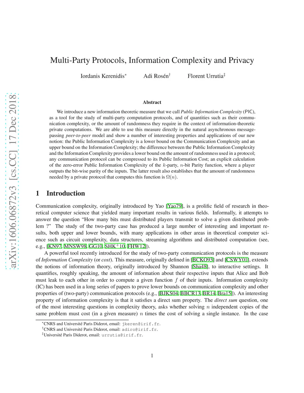 We introduce the new measure of Public Information Complexity (PIC), as a tool for the study of multi-party computation protocols, and of quantities such as their communication complexity, or the amount of randomness they require in the context of information-theoretic private computations. We are able to use this measure directly in the natural asynchronous message-passing peer-to-peer model and show a number of interesting properties and applications of our new notion: the Public Information Complexity is a lower bound on the Communication Complexity and an upper bound on the Information Complexity; the difference between the Public Information Complexity and the Information Complexity provides a lower bound on the amount of randomness used in a protocol; any communication protocol can be compressed to its Public Information Cost; an explicit calculation of the zero-error Public Information Complexity of the k-party, n-bit Parity function, where a player outputs the bit-wise parity of the inputs. The latter result establishes that the amount of randomness needed for a private protocol that computes this function is Omega(n).