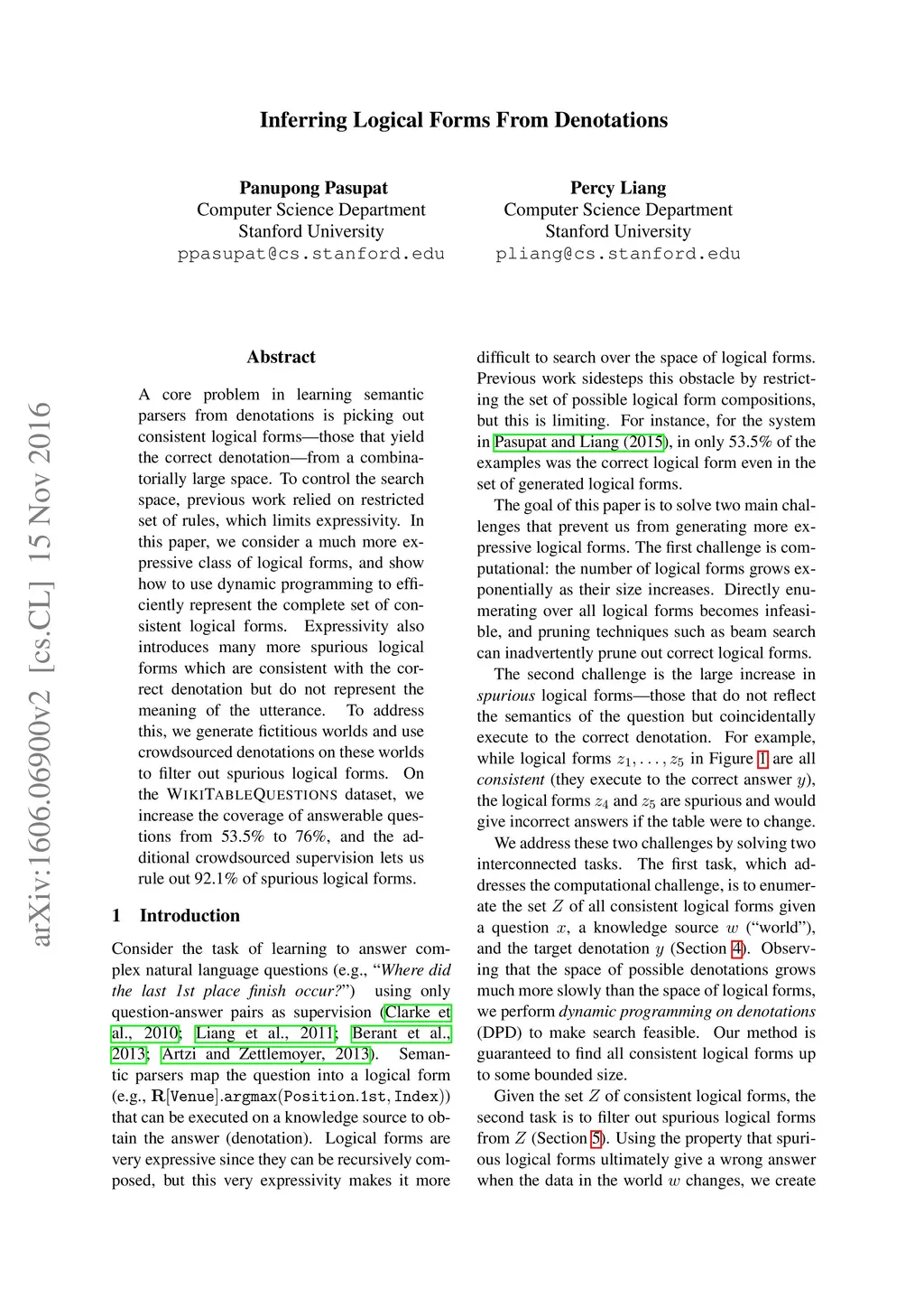 A core problem in learning semantic parsers from denotations is picking out consistent logical forms--those that yield the correct denotation--from a combinatorially large space. To control the search space, previous work relied on restricted set of rules, which limits expressivity. In this paper, we consider a much more expressive class of logical forms, and show how to use dynamic programming to efficiently represent the complete set of consistent logical forms. Expressivity also introduces many more spurious logical forms which are consistent with the correct denotation but do not represent the meaning of the utterance. To address this, we generate fictitious worlds and use crowdsourced denotations on these worlds to filter out spurious logical forms. On the WikiTableQuestions dataset, we increase the coverage of answerable questions from 53.5% to 76%, and the additional crowdsourced supervision lets us rule out 92.1% of spurious logical forms.