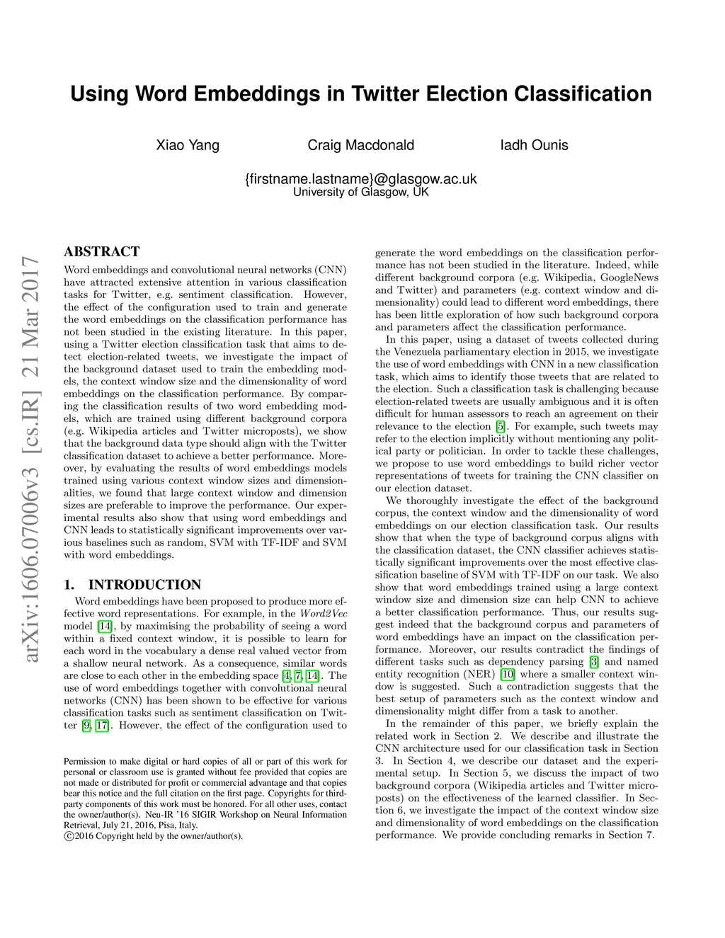 Using Word Embeddings in Twitter Election Classification