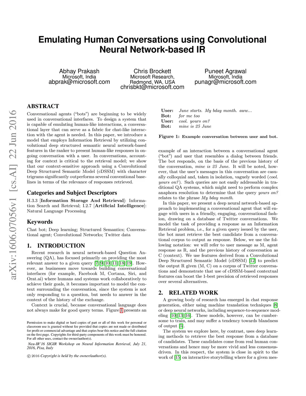 Conversational agents ("bots") are beginning to be widely used in conversational interfaces. To design a system that is capable of emulating human-like interactions, a conversational layer that can serve as a fabric for chat-like interaction with the agent is needed. In this paper, we introduce a model that employs Information Retrieval by utilizing convolutional deep structured semantic neural network-based features in the ranker to present human-like responses in ongoing conversation with a user. In conversations, accounting for context is critical to the retrieval model; we show that our context-sensitive approach using a Convolutional Deep Structured Semantic Model (cDSSM) with character trigrams significantly outperforms several conventional baselines in terms of the relevance of responses retrieved.