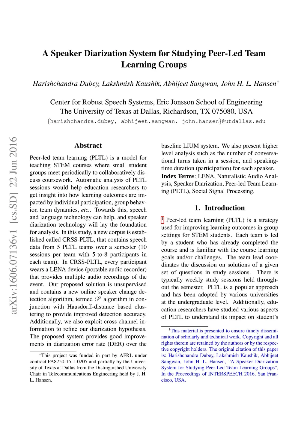 A Speaker Diarization System for Studying Peer-Led Team Learning Groups