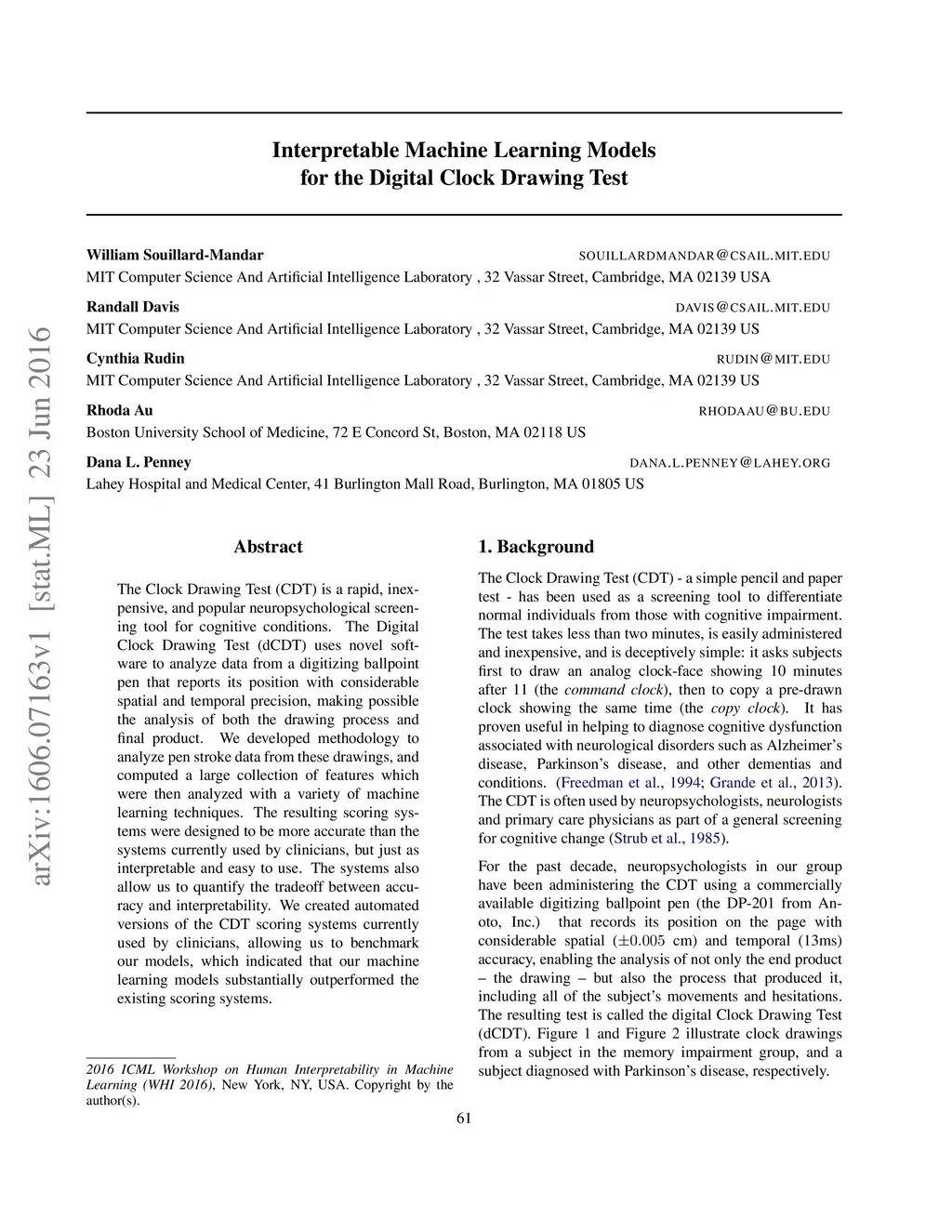 Interpretable Machine Learning Models for the Digital Clock Drawing Test