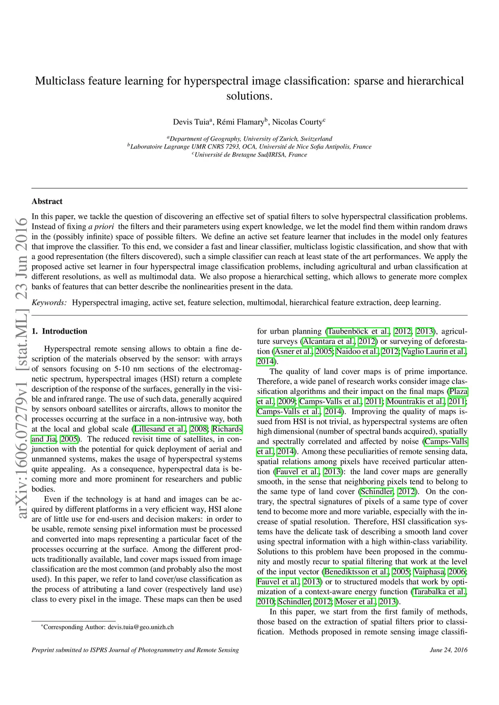 In this paper, we tackle the question of discovering an effective set of spatial filters to solve hyperspectral classification problems. Instead of fixing a priori the filters and their parameters using expert knowledge, we let the model find them within random draws in the (possibly infinite) space of possible filters. We define an active set feature learner that includes in the model only features that improve the classifier. To this end, we consider a fast and linear classifier, multiclass logistic classification, and show that with a good representation (the filters discovered), such a simple classifier can reach at least state of the art performances. We apply the proposed active set learner in four hyperspectral image classification problems, including agricultural and urban classification at different resolutions, as well as multimodal data. We also propose a hierarchical setting, which allows to generate more complex banks of features that can better describe the nonlinearities present in the data.