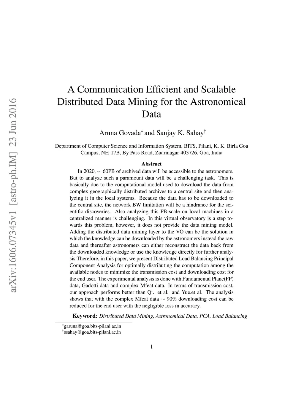 In 2020, ~60PB of archived data will be accessible to the astronomers. But to analyze such a paramount data will be a challenging task. This is basically due to the computational model used to download the data from complex geographically distributed archives to a central site and then analyzing it in the local systems. Because the data has to be downloaded to the central site, the network BW limitation will be a hindrance for the scientific discoveries. Also analyzing this PB-scale on local machines in a centralized manner is challenging. In this virtual observatory is a step towards this problem, however, it does not provide the data mining model. Adding the distributed data mining layer to the VO can be the solution in which the knowledge can be downloaded by the astronomers instead the raw data and thereafter astronomers can either reconstruct the data back from the downloaded knowledge or use the knowledge directly for further analysis.Therefore, in this paper, we present Distributed Load Balancing Principal Component Analysis for optimally distributing the computation among the available nodes to minimize the transmission cost and downloading cost for the end user. The experimental analysis is done with Fundamental Plane(FP) data, Gadotti data and complex Mfeat data. In terms of transmission cost, our approach performs better than Qi. et al. and Yue.et al. The analysis shows that with the complex Mfeat data ~90% downloading cost can be reduced for the end user with the negligible loss in accuracy.