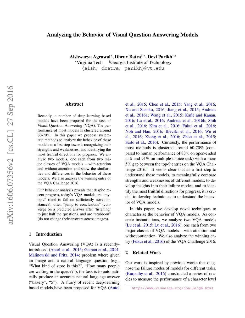 Recently, a number of deep-learning based models have been proposed for the task of Visual Question Answering (VQA). The performance of most models is clustered around 60-70%. In this paper we propose systematic methods to analyze the behavior of these models as a first step towards recognizing their strengths and weaknesses, and identifying the most fruitful directions for progress. We analyze two models, one each from two major classes of VQA models -- with-attention and without-attention and show the similarities and differences in the behavior of these models. We also analyze the winning entry of the VQA Challenge 2016. Our behavior analysis reveals that despite recent progress, today's VQA models are "myopic" (tend to fail on sufficiently novel instances), often "jump to conclusions" (converge on a predicted answer after 'listening' to just half the question), and are "stubborn" (do not change their answers across images).