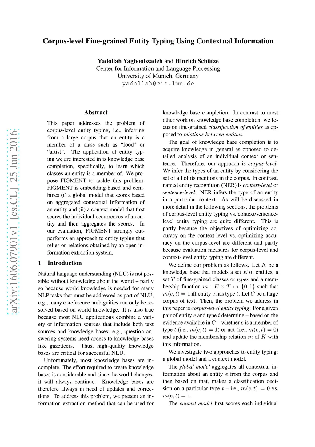 This paper addresses the problem of corpus-level entity typing, i.e., inferring from a large corpus that an entity is a member of a class such as "food" or "artist". The application of entity typing we are interested in is knowledge base completion, specifically, to learn which classes an entity is a member of. We propose FIGMENT to tackle this problem. FIGMENT is embedding-based and combines (i) a global model that scores based on aggregated contextual information of an entity and (ii) a context model that first scores the individual occurrences of an entity and then aggregates the scores. In our evaluation, FIGMENT strongly outperforms an approach to entity typing that relies on relations obtained by an open information extraction system.