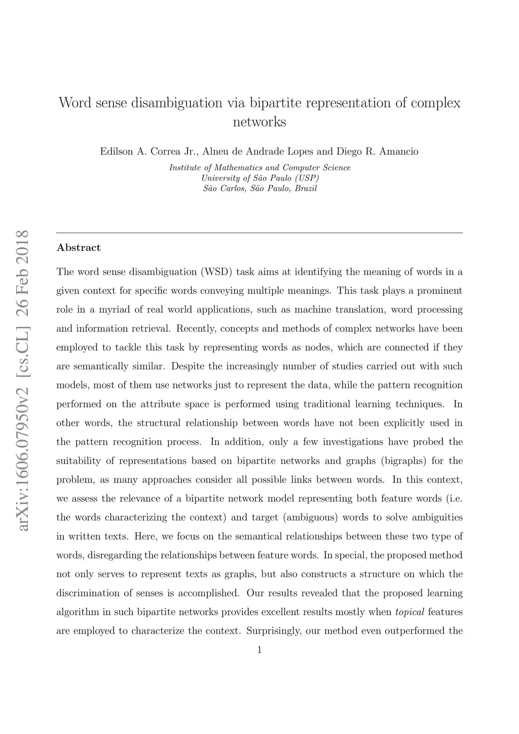 In recent years, concepts and methods of complex networks have been employed to tackle the word sense disambiguation (WSD) task by representing words as nodes, which are connected if they are semantically similar. Despite the increasingly number of studies carried out with such models, most of them use networks just to represent the data, while the pattern recognition performed on the attribute space is performed using traditional learning techniques. In other words, the structural relationship between words have not been explicitly used in the pattern recognition process. In addition, only a few investigations have probed the suitability of representations based on bipartite networks and graphs (bigraphs) for the problem, as many approaches consider all possible links between words. In this context, we assess the relevance of a bipartite network model representing both feature words (i.e. the words characterizing the context) and target (ambiguous) words to solve ambiguities in written texts. Here, we focus on the semantical relationships between these two type of words, disregarding the relationships between feature words. In special, the proposed method not only serves to represent texts as graphs, but also constructs a structure on which the discrimination of senses is accomplished. Our results revealed that the proposed learning algorithm in such bipartite networks provides excellent results mostly when topical features are employed to characterize the context. Surprisingly, our method even outperformed the support vector machine algorithm in particular cases, with the advantage of being robust even if a small training dataset is available. Taken together, the results obtained here show that the proposed representation/classification method might be useful to improve the semantical characterization of written texts.