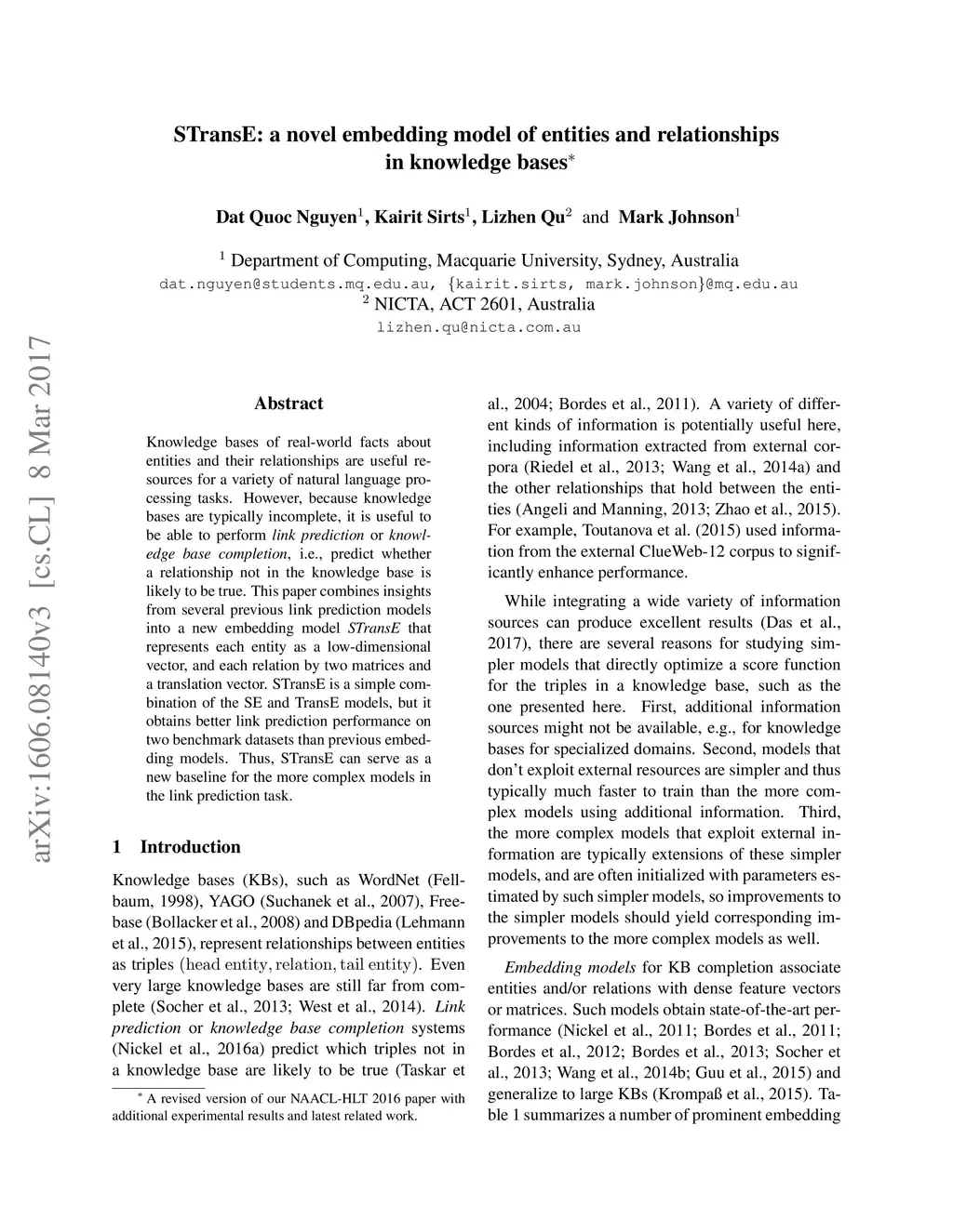 Knowledge bases of real-world facts about entities and their relationships are useful resources for a variety of natural language processing tasks. However, because knowledge bases are typically incomplete, it is useful to be able to perform link prediction or knowledge base completion, i.e., predict whether a relationship not in the knowledge base is likely to be true. This paper combines insights from several previous link prediction models into a new embedding model STransE that represents each entity as a low-dimensional vector, and each relation by two matrices and a translation vector. STransE is a simple combination of the SE and TransE models, but it obtains better link prediction performance on two benchmark datasets than previous embedding models. Thus, STransE can serve as a new baseline for the more complex models in the link prediction task.