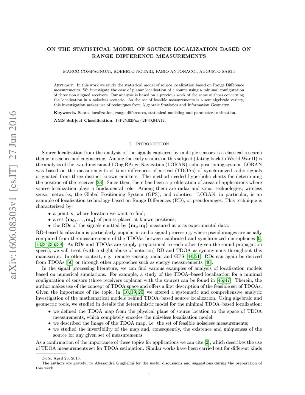In this work we study the statistical model of source localization based on Range Difference measurements. We investigate the case of planar localization of a source using a minimal configuration of three non aligned receivers. Our analysis is based on a previous work of the same authors concerning the localization in a noiseless scenario. As the set of feasible measurements is a semialgebraic variety, this investigation makes use of techniques from Algebraic Statistics and Information Geometry.