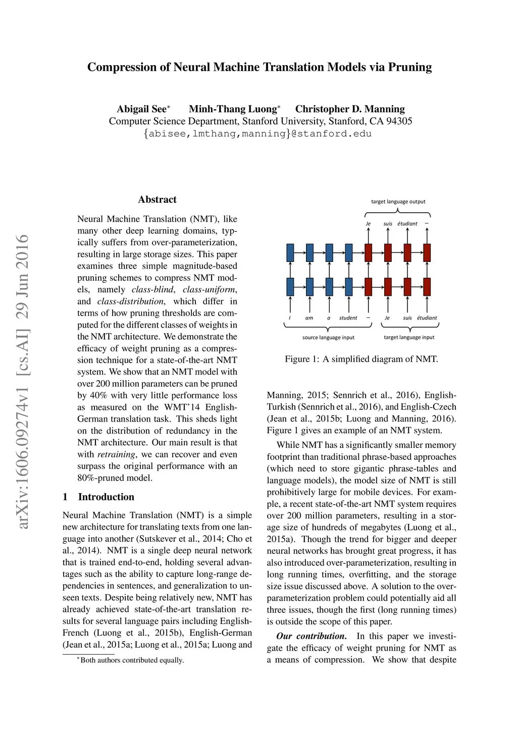 Neural Machine Translation (NMT), like many other deep learning domains, typically suffers from over-parameterization, resulting in large storage sizes. This paper examines three simple magnitude-based pruning schemes to compress NMT models, namely class-blind, class-uniform, and class-distribution, which differ in terms of how pruning thresholds are computed for the different classes of weights in the NMT architecture. We demonstrate the efficacy of weight pruning as a compression technique for a state-of-the-art NMT system. We show that an NMT model with over 200 million parameters can be pruned by 40% with very little performance loss as measured on the WMT'14 English-German translation task. This sheds light on the distribution of redundancy in the NMT architecture. Our main result is that with retraining, we can recover and even surpass the original performance with an 80%-pruned model.