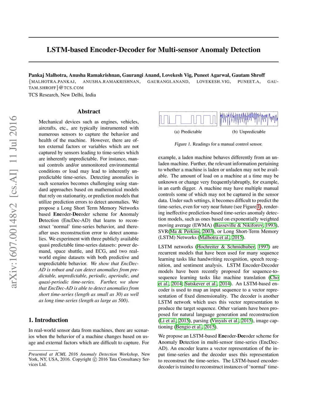 Mechanical devices such as engines, vehicles, aircrafts, etc., are typically instrumented with numerous sensors to capture the behavior and health of the machine. However, there are often external factors or variables which are not captured by sensors leading to time-series which are inherently unpredictable. For instance, manual controls and/or unmonitored environmental conditions or load may lead to inherently unpredictable time-series. Detecting anomalies in such scenarios becomes challenging using standard approaches based on mathematical models that rely on stationarity, or prediction models that utilize prediction errors to detect anomalies. We propose a Long Short Term Memory Networks based Encoder-Decoder scheme for Anomaly Detection (EncDec-AD) that learns to reconstruct ñormal' time-series behavior, and thereafter uses reconstruction error to detect anomalies. We experiment with three publicly available quasi predictable time-series datasets: power demand, space shuttle, and ECG, and two real-world engine datasets with both predictive and unpredictable behavior. We show that EncDec-AD is robust and can detect anomalies from predictable, unpredictable, periodic, aperiodic, and quasi-periodic time-series. Further, we show that EncDec-AD is able to detect anomalies from short time-series (length as small as 30) as well as long time-series (length as large as 500).