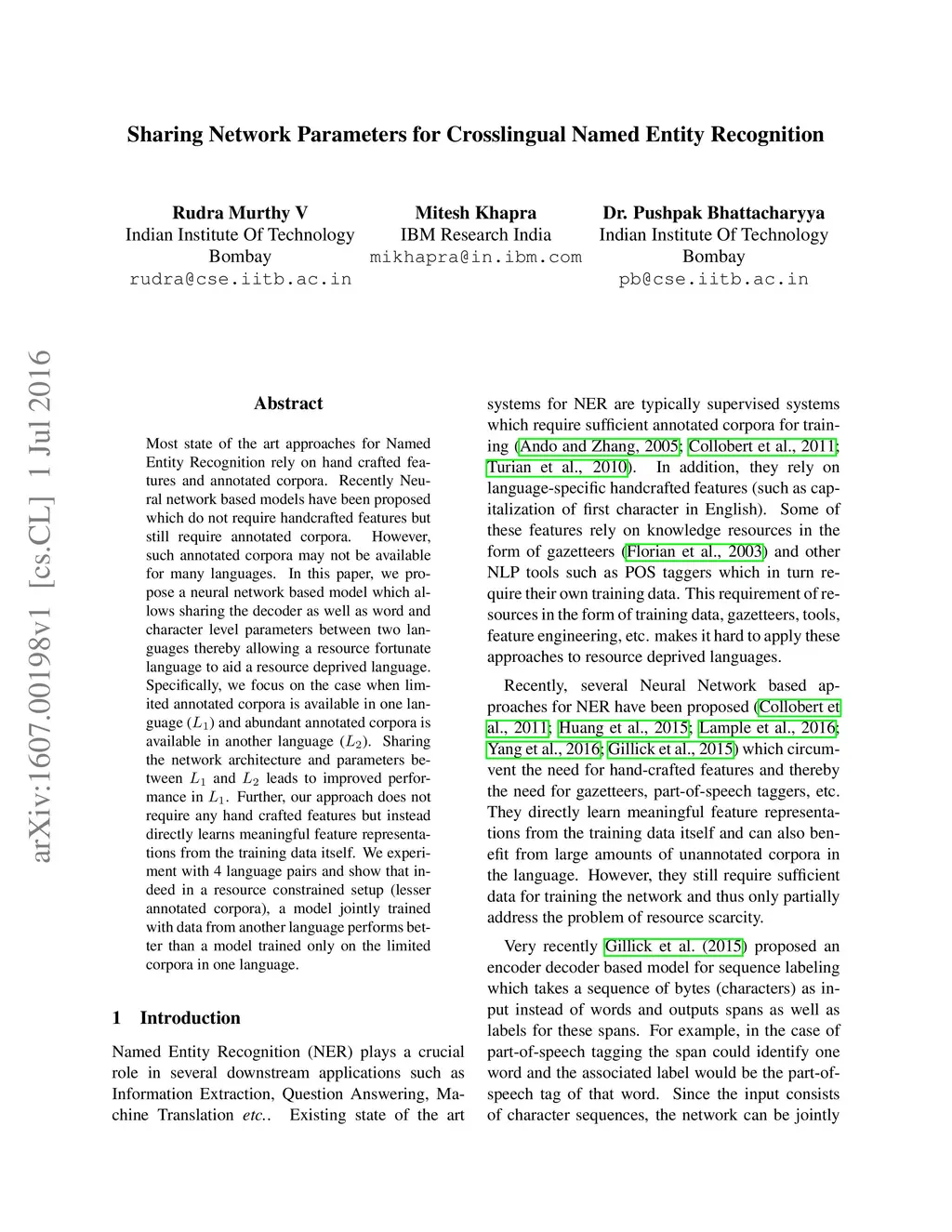 Sharing Network Parameters for Crosslingual Named Entity Recognition