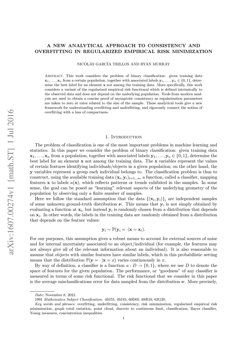 This work considers the problem of binary classification: given training data from a certain population, together with associated labels , determine the best label for an element not among the training data. More specifically, this work considers a variant of the regularized empirical risk functional which is defined intrinsically to the observed data and does not depend on the underlying population. Tools from modern analysis are used to obtain a concise proof of asymptotic consistency as regularization parameters are taken to zero at rates related to the size of the sample. These analytical tools give a new framework for understanding overfitting and underfitting, and rigorously connect the notion of overfitting with a loss of compactness.