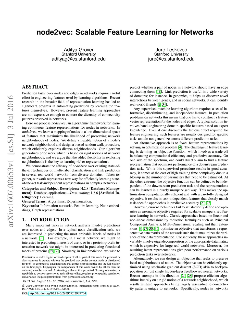 Prediction tasks over nodes and edges in networks require careful effort in engineering features used by learning algorithms. Recent research in the broader field of representation learning has led to significant progress in automating prediction by learning the features themselves. However, present feature learning approaches are not expressive enough to capture the diversity of connectivity patterns observed in networks. Here we propose node2vec, an algorithmic framework for learning continuous feature representations for nodes in networks. In node2vec, we learn a mapping of nodes to a low-dimensional space of features that maximizes the likelihood of preserving network neighborhoods of nodes. We define a flexible notion of a node's network neighborhood and design a biased random walk procedure, which efficiently explores diverse neighborhoods. Our algorithm generalizes prior work which is based on rigid notions of network neighborhoods, and we argue that the added flexibility in exploring neighborhoods is the key to learning richer representations. We demonstrate the efficacy of node2vec over existing state-of-the-art techniques on multi-label classification and link prediction in several real-world networks from diverse domains. Taken together, our work represents a new way for efficiently learning state-of-the-art task-independent representations in complex networks.