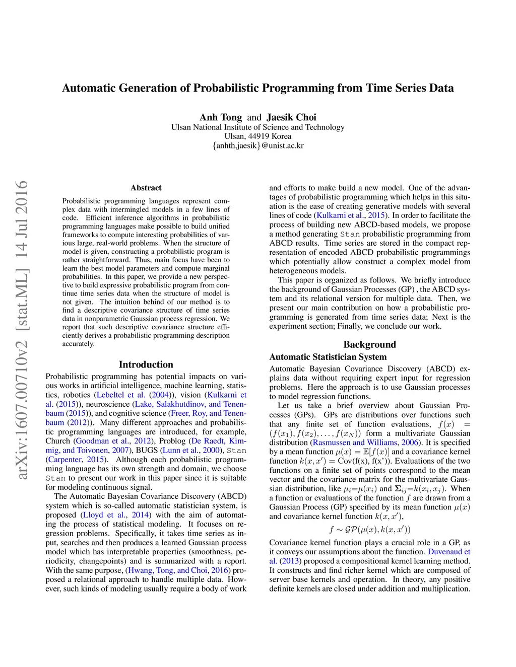 Probabilistic programming languages represent complex data with intermingled models in a few lines of code. Efficient inference algorithms in probabilistic programming languages make possible to build unified frameworks to compute interesting probabilities of various large, real-world problems. When the structure of model is given, constructing a probabilistic program is rather straightforward. Thus, main focus have been to learn the best model parameters and compute marginal probabilities. In this paper, we provide a new perspective to build expressive probabilistic program from continue time series data when the structure of model is not given. The intuition behind of our method is to find a descriptive covariance structure of time series data in nonparametric Gaussian process regression. We report that such descriptive covariance structure efficiently derives a probabilistic programming description accurately.
