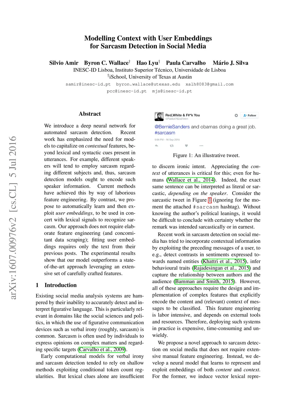 Modelling Context with User Embeddings for Sarcasm Detection in Social