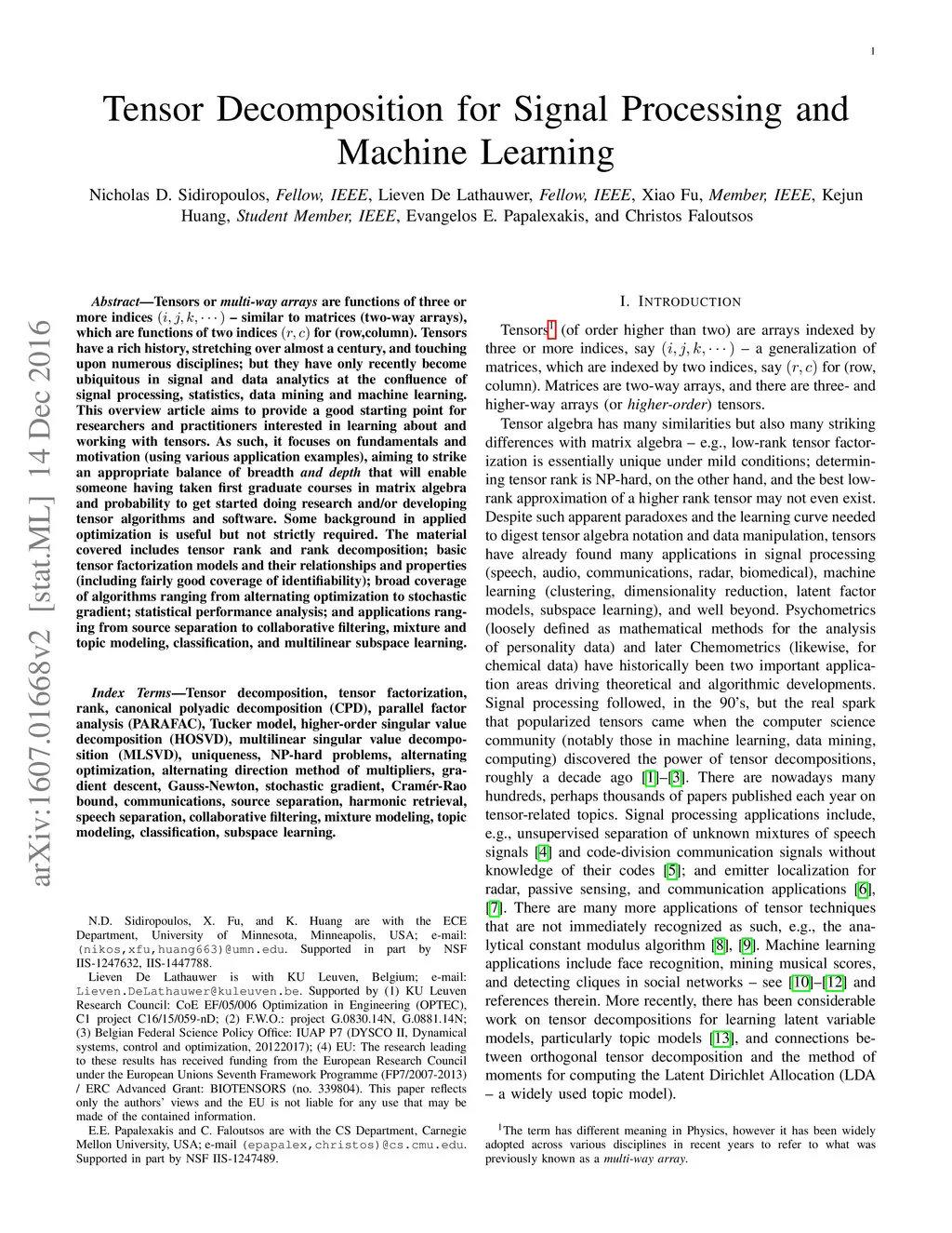 Tensors or {\em multi-way arrays} are functions of three or more indices -- similar to matrices (two-way arrays), which are functions of two indices for (row,column). Tensors have a rich history, stretching over almost a century, and touching upon numerous disciplines; but they have only recently become ubiquitous in signal and data analytics at the confluence of signal processing, statistics, data mining and machine learning. This overview article aims to provide a good starting point for researchers and practitioners interested in learning about and working with tensors. As such, it focuses on fundamentals and motivation (using various application examples), aiming to strike an appropriate balance of breadth {\em and depth} that will enable someone having taken first graduate courses in matrix algebra and probability to get started doing research and/or developing tensor algorithms and software. Some background in applied optimization is useful but not strictly required. The material covered includes tensor rank and rank decomposition; basic tensor factorization models and their relationships and properties (including fairly good coverage of identifiability); broad coverage of algorithms ranging from alternating optimization to stochastic gradient; statistical performance analysis; and applications ranging from source separation to collaborative filtering, mixture and topic modeling, classification, and multilinear subspace learning.