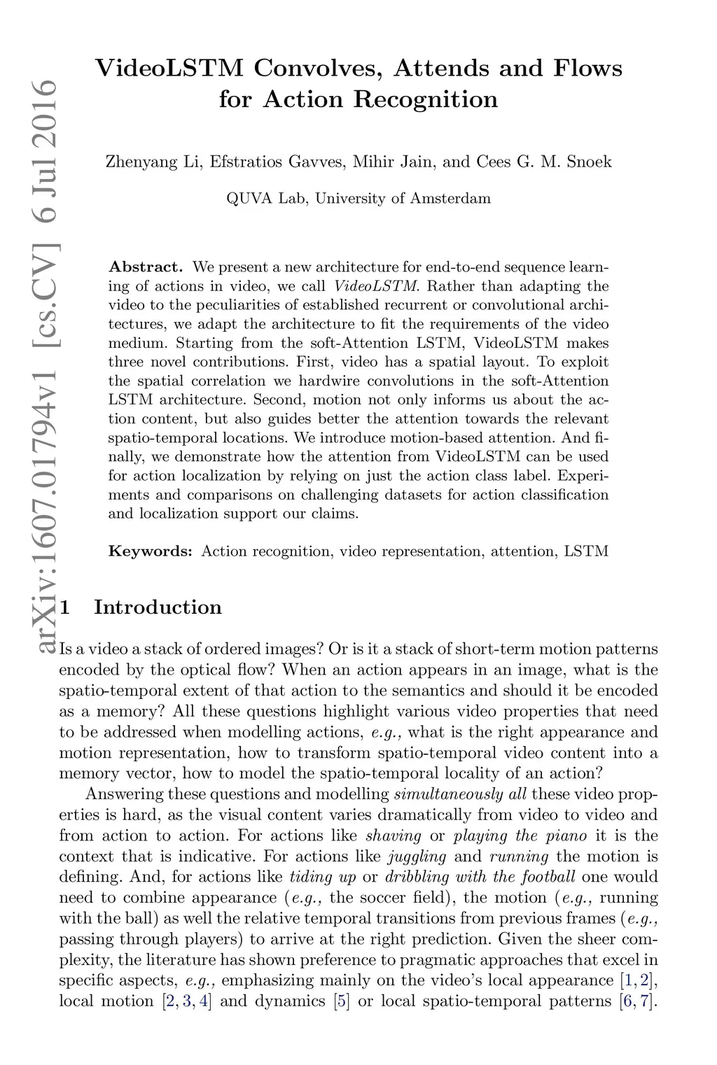 We present a new architecture for end-to-end sequence learning of actions in video, we call VideoLSTM. Rather than adapting the video to the peculiarities of established recurrent or convolutional architectures, we adapt the architecture to fit the requirements of the video medium. Starting from the soft-Attention LSTM, VideoLSTM makes three novel contributions. First, video has a spatial layout. To exploit the spatial correlation we hardwire convolutions in the soft-Attention LSTM architecture. Second, motion not only informs us about the action content, but also guides better the attention towards the relevant spatio-temporal locations. We introduce motion-based attention. And finally, we demonstrate how the attention from VideoLSTM can be used for action localization by relying on just the action class label. Experiments and comparisons on challenging datasets for action classification and localization support our claims.