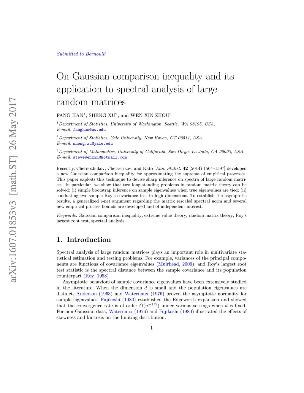 Recently, Chernozhukov, Chetverikov, and Kato [Ann. Statist. 42 (2014) 1564--1597] developed a new Gaussian comparison inequality for approximating the suprema of empirical processes. This paper exploits this technique to devise sharp inference on spectra of large random matrices. In particular, we show that two long-standing problems in random matrix theory can be solved: (i) simple bootstrap inference on sample eigenvalues when true eigenvalues are tied; (ii) conducting two-sample Roy's covariance test in high dimensions. To establish the asymptotic results, a generalized -net argument regarding the matrix rescaled spectral norm and several new empirical process bounds are developed and of independent interest.