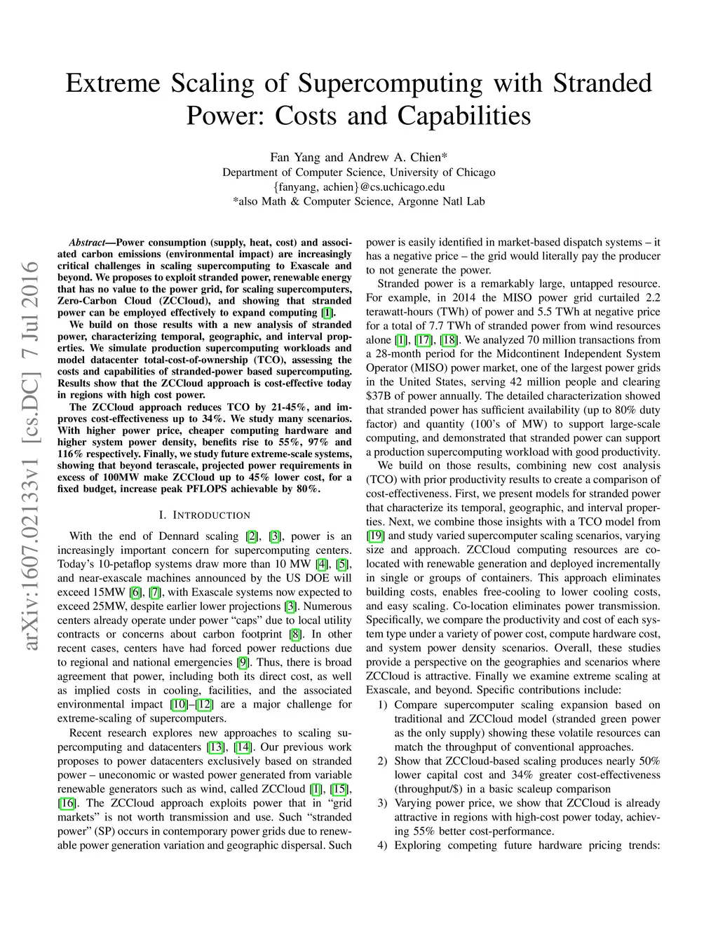 Power consumption (supply, heat, cost) and associated carbon emissions (environmental impact) are increasingly critical challenges in scaling supercomputing to Exascale and beyond. We proposes to exploit stranded power, renewable energy that has no value to the power grid, for scaling supercomputers, Zero-Carbon Cloud (ZCCloud), and showing that stranded power can be employed effectively to expand computing [1]. We build on those results with a new analysis of stranded power, characterizing temporal, geographic, and interval properties. We simulate production supercomputing workloads and model datacenter total-cost-of-ownership (TCO), assessing the costs and capabilities of stranded-power based supercomputing. Results show that the ZCCloud approach is cost-effective today in regions with high cost power. The ZCCloud approach reduces TCO by 21-45%, and improves cost-effectiveness up to 34%. We study many scenarios. With higher power price, cheaper computing hardware and higher system power density, benefits rise to 55%, 97% and 116% respectively. Finally, we study future extreme-scale systems, showing that beyond terascale, projected power requirements in excess of 100MW make ZCCloud up to 45% lower cost, for a fixed budget, increase peak PFLOPS achievable by 80%.