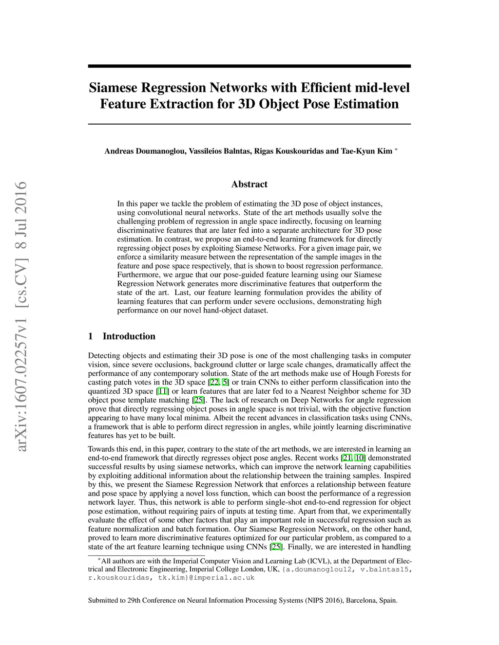 In this paper we tackle the problem of estimating the 3D pose of object instances, using convolutional neural networks. State of the art methods usually solve the challenging problem of regression in angle space indirectly, focusing on learning discriminative features that are later fed into a separate architecture for 3D pose estimation. In contrast, we propose an end-to-end learning framework for directly regressing object poses by exploiting Siamese Networks. For a given image pair, we enforce a similarity measure between the representation of the sample images in the feature and pose space respectively, that is shown to boost regression performance. Furthermore, we argue that our pose-guided feature learning using our Siamese Regression Network generates more discriminative features that outperform the state of the art. Last, our feature learning formulation provides the ability of learning features that can perform under severe occlusions, demonstrating high performance on our novel hand-object dataset.
