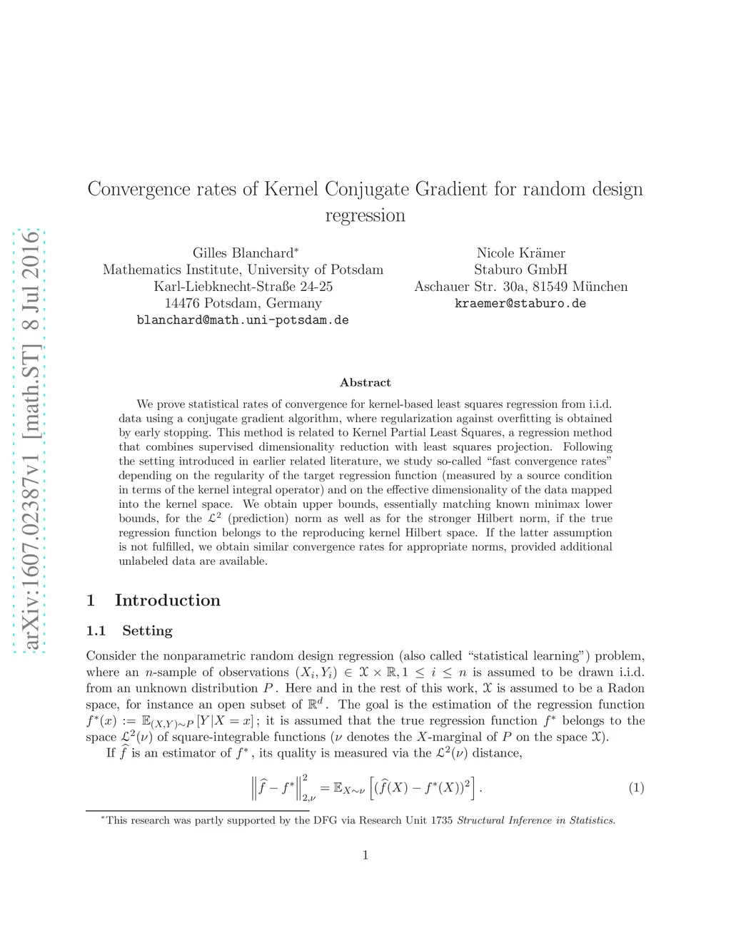 We prove statistical rates of convergence for kernel-based least squares regression from i.i.d. data using a conjugate gradient algorithm, where regularization against overfitting is obtained by early stopping. This method is related to Kernel Partial Least Squares, a regression method that combines supervised dimensionality reduction with least squares projection. Following the setting introduced in earlier related literature, we study so-called "fast convergence rates" depending on the regularity of the target regression function (measured by a source condition in terms of the kernel integral operator) and on the effective dimensionality of the data mapped into the kernel space. We obtain upper bounds, essentially matching known minimax lower bounds, for the (prediction) norm as well as for the stronger Hilbert norm, if the true regression function belongs to the reproducing kernel Hilbert space. If the latter assumption is not fulfilled, we obtain similar convergence rates for appropriate norms, provided additional unlabeled data are available.