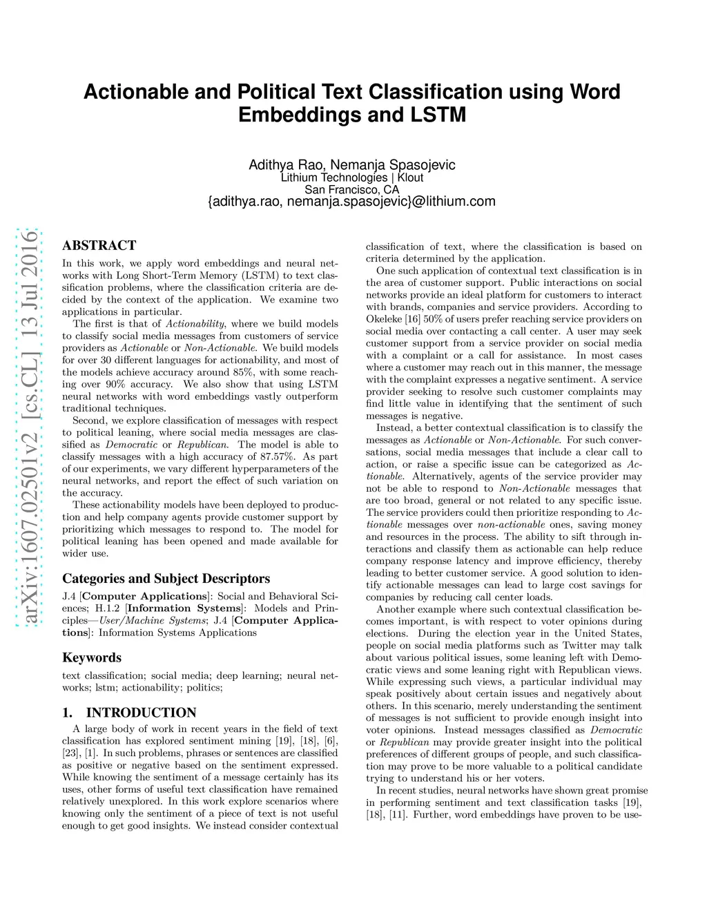 In this work, we apply word embeddings and neural networks with Long Short-Term Memory (LSTM) to text classification problems, where the classification criteria are decided by the context of the application. We examine two applications in particular. The first is that of Actionability, where we build models to classify social media messages from customers of service providers as Actionable or Non-Actionable. We build models for over 30 different languages for actionability, and most of the models achieve accuracy around 85%, with some reaching over 90% accuracy. We also show that using LSTM neural networks with word embeddings vastly outperform traditional techniques. Second, we explore classification of messages with respect to political leaning, where social media messages are classified as Democratic or Republican. The model is able to classify messages with a high accuracy of 87.57%. As part of our experiments, we vary different hyperparameters of the neural networks, and report the effect of such variation on the accuracy. These actionability models have been deployed to production and help company agents provide customer support by prioritizing which messages to respond to. The model for political leaning has been opened and made available for wider use.