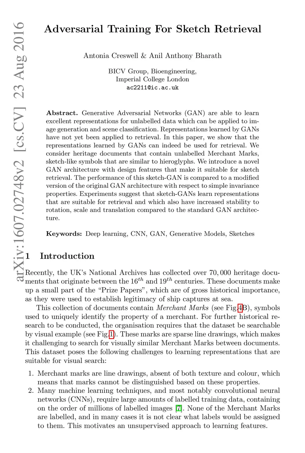 Generative Adversarial Networks (GAN) are able to learn excellent representations for unlabelled data which can be applied to image generation and scene classification. Representations learned by GANs have not yet been applied to retrieval. In this paper, we show that the representations learned by GANs can indeed be used for retrieval. We consider heritage documents that contain unlabelled Merchant Marks, sketch-like symbols that are similar to hieroglyphs. We introduce a novel GAN architecture with design features that make it suitable for sketch retrieval. The performance of this sketch-GAN is compared to a modified version of the original GAN architecture with respect to simple invariance properties. Experiments suggest that sketch-GANs learn representations that are suitable for retrieval and which also have increased stability to rotation, scale and translation compared to the standard GAN architecture.