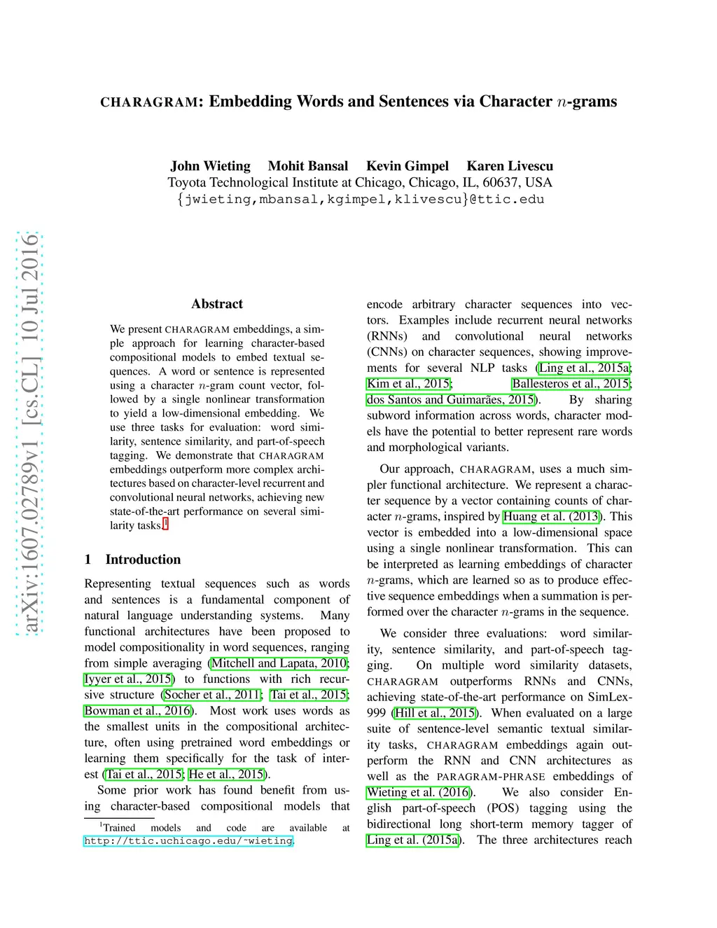 We present Charagram embeddings, a simple approach for learning character-based compositional models to embed textual sequences. A word or sentence is represented using a character n-gram count vector, followed by a single nonlinear transformation to yield a low-dimensional embedding. We use three tasks for evaluation: word similarity, sentence similarity, and part-of-speech tagging. We demonstrate that Charagram embeddings outperform more complex architectures based on character-level recurrent and convolutional neural networks, achieving new state-of-the-art performance on several similarity tasks.