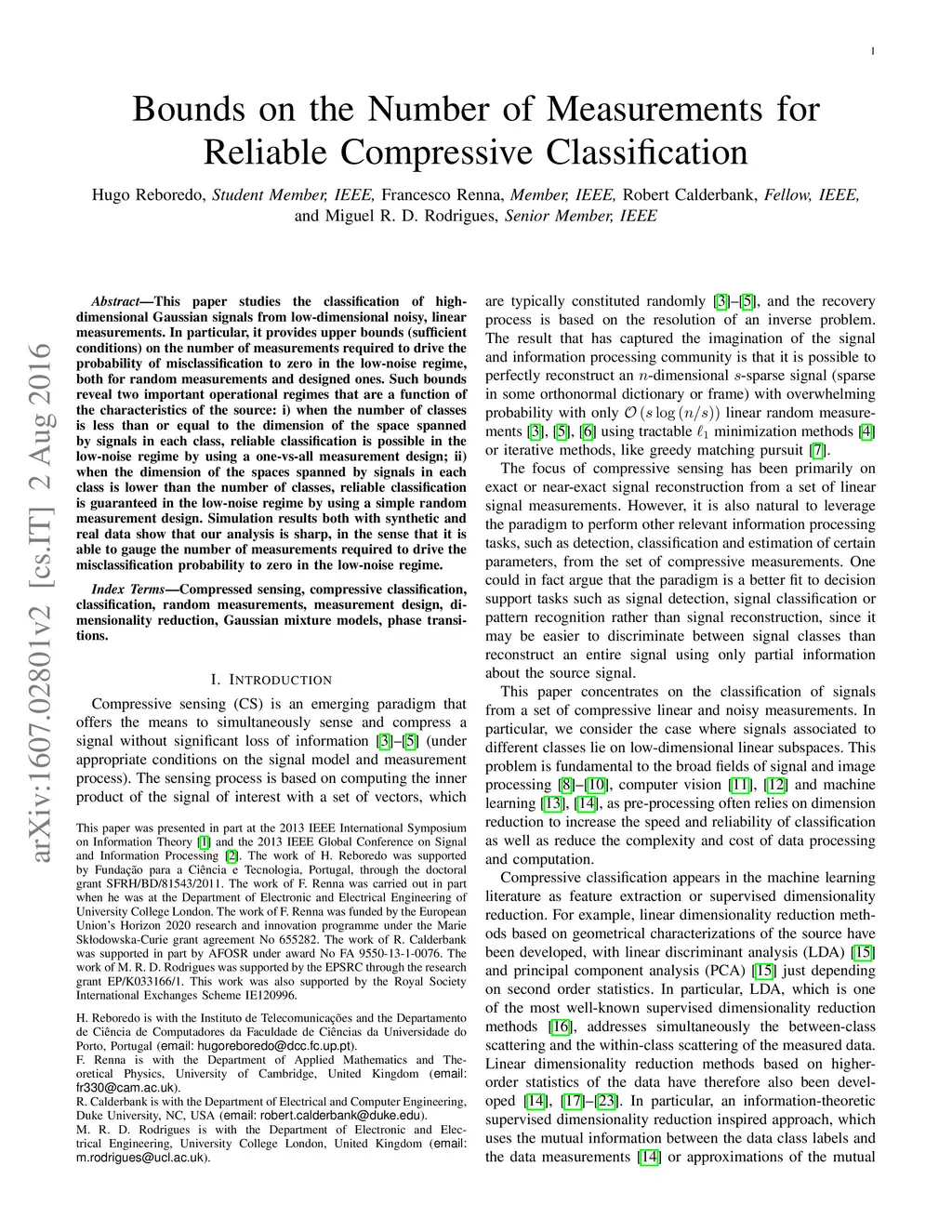 This paper studies the classification of high-dimensional Gaussian signals from low-dimensional noisy, linear measurements. In particular, it provides upper bounds (sufficient conditions) on the number of measurements required to drive the probability of misclassification to zero in the low-noise regime, both for random measurements and designed ones. Such bounds reveal two important operational regimes that are a function of the characteristics of the source: i) when the number of classes is less than or equal to the dimension of the space spanned by signals in each class, reliable classification is possible in the low-noise regime by using a one-vs-all measurement design; ii) when the dimension of the spaces spanned by signals in each class is lower than the number of classes, reliable classification is guaranteed in the low-noise regime by using a simple random measurement design. Simulation results both with synthetic and real data show that our analysis is sharp, in the sense that it is able to gauge the number of measurements required to drive the misclassification probability to zero in the low-noise regime.