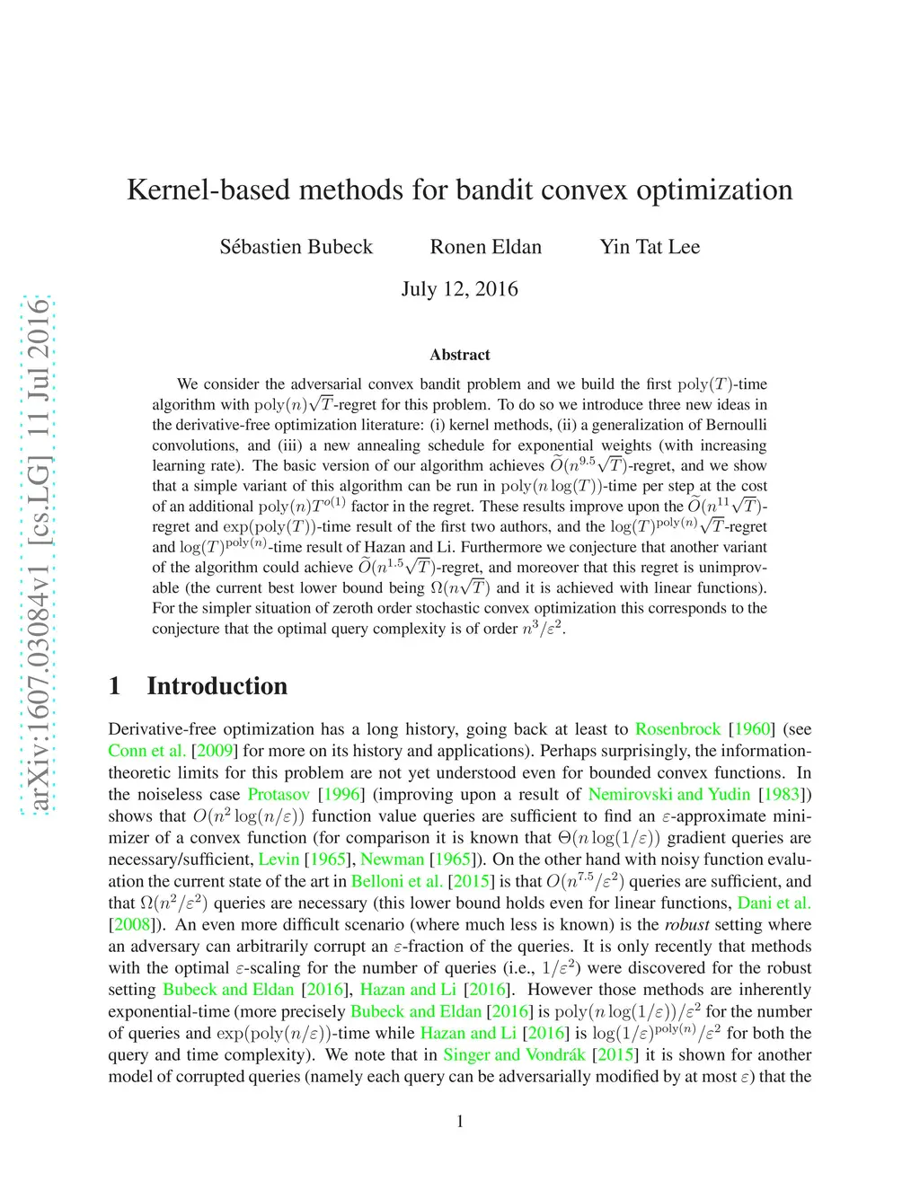 We consider the adversarial convex bandit problem and we build the first -time algorithm with -regret for this problem. To do so we introduce three new ideas in the derivative-free optimization literature: (i) kernel methods, (ii) a generalization of Bernoulli convolutions, and (iii) a new annealing schedule for exponential weights (with increasing learning rate). The basic version of our algorithm achieves -regret, and we show that a simple variant of this algorithm can be run in -time per step at the cost of an additional factor in the regret. These results improve upon the -regret and -time result of the first two authors, and the -regret and -time result of Hazan and Li. Furthermore we conjecture that another variant of the algorithm could achieve -regret, and moreover that this regret is unimprovable (the current best lower bound being and it is achieved with linear functions). For the simpler situation of zeroth order stochastic convex optimization this corresponds to the conjecture that the optimal query complexity is of order .