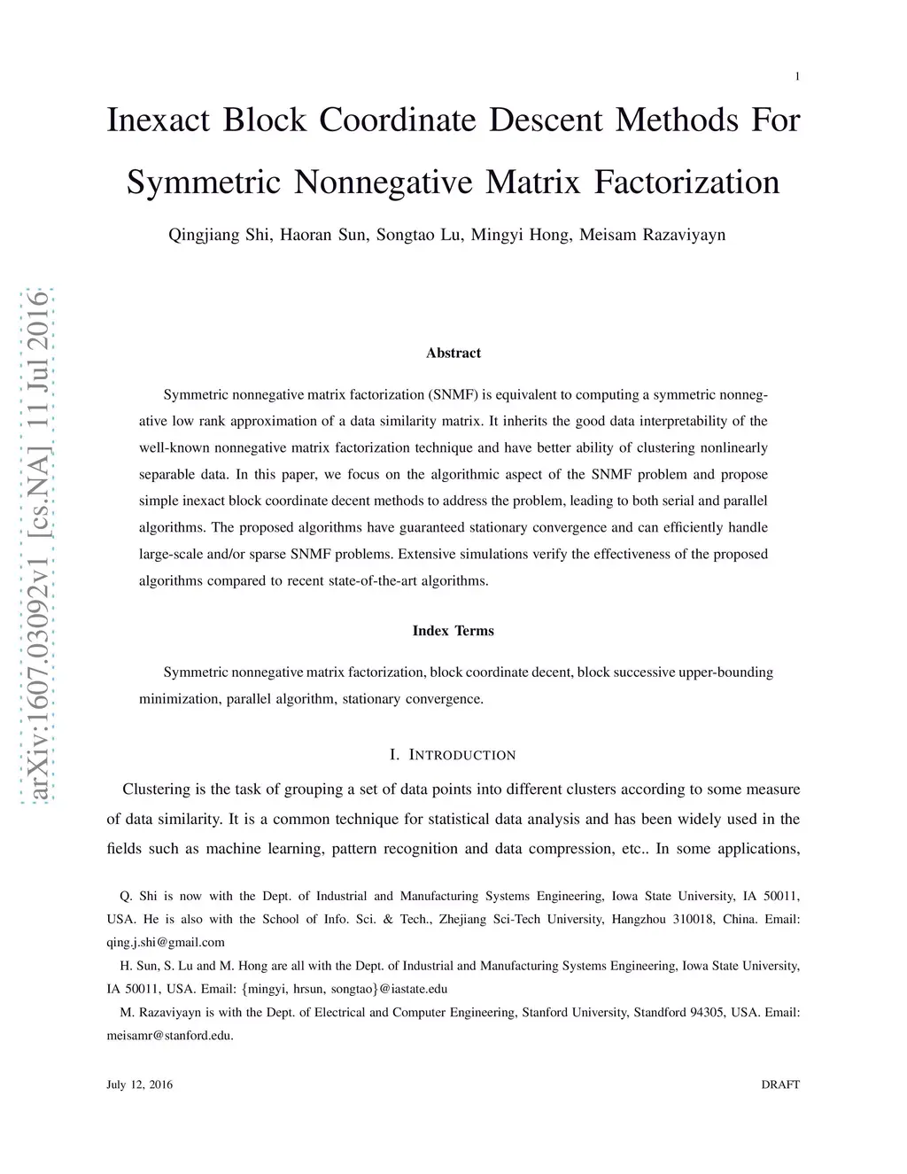 Symmetric nonnegative matrix factorization (SNMF) is equivalent to computing a symmetric nonnegative low rank approximation of a data similarity matrix. It inherits the good data interpretability of the well-known nonnegative matrix factorization technique and have better ability of clustering nonlinearly separable data. In this paper, we focus on the algorithmic aspect of the SNMF problem and propose simple inexact block coordinate decent methods to address the problem, leading to both serial and parallel algorithms. The proposed algorithms have guaranteed stationary convergence and can efficiently handle large-scale and/or sparse SNMF problems. Extensive simulations verify the effectiveness of the proposed algorithms compared to recent state-of-the-art algorithms.