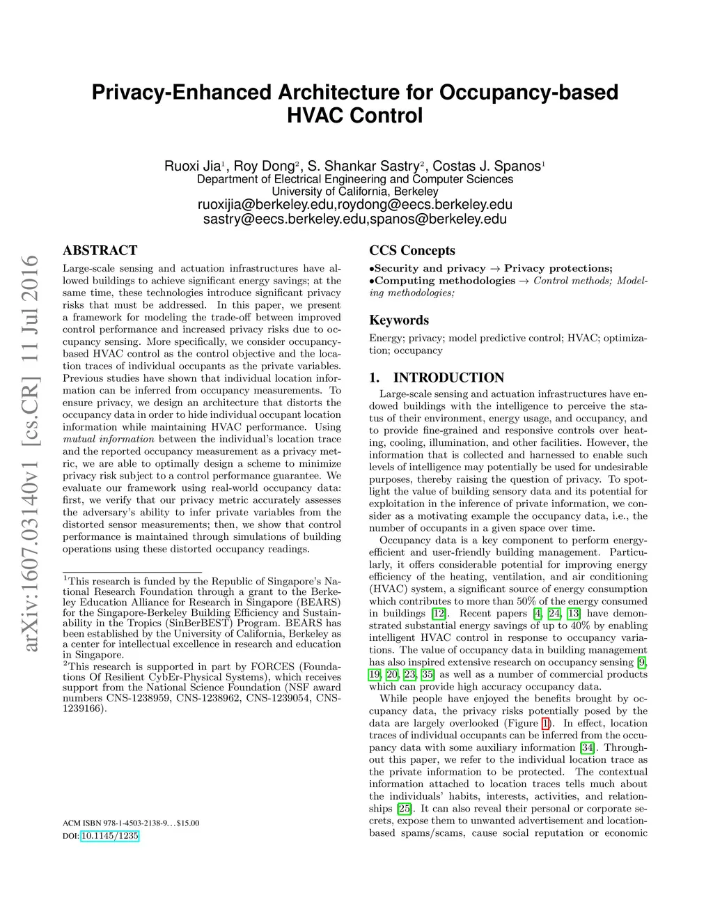 Privacy-Enhanced Architecture for Occupancy-based HVAC Control