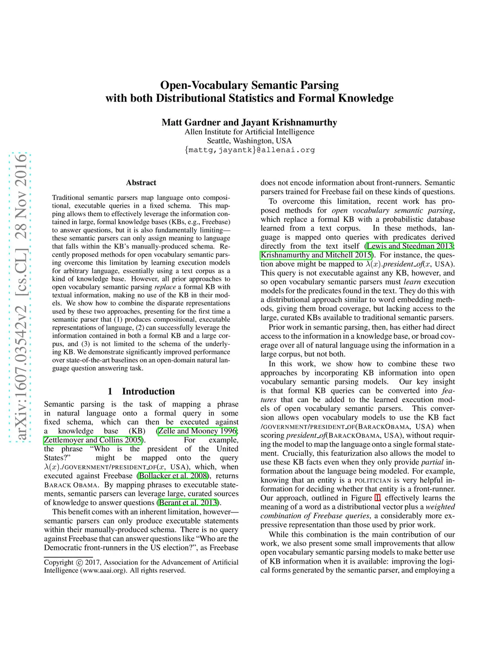 Traditional semantic parsers map language onto compositional, executable queries in a fixed schema. This mapping allows them to effectively leverage the information contained in large, formal knowledge bases (KBs, e.g., Freebase) to answer questions, but it is also fundamentally limiting---these semantic parsers can only assign meaning to language that falls within the KB's manually-produced schema. Recently proposed methods for open vocabulary semantic parsing overcome this limitation by learning execution models for arbitrary language, essentially using a text corpus as a kind of knowledge base. However, all prior approaches to open vocabulary semantic parsing replace a formal KB with textual information, making no use of the KB in their models. We show how to combine the disparate representations used by these two approaches, presenting for the first time a semantic parser that (1) produces compositional, executable representations of language, (2) can successfully leverage the information contained in both a formal KB and a large corpus, and (3) is not limited to the schema of the underlying KB. We demonstrate significantly improved performance over state-of-the-art baselines on an open-domain natural language question answering task.