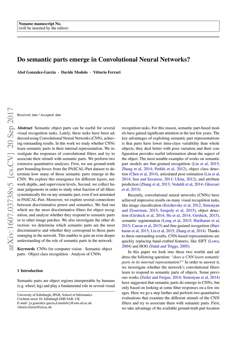 Do semantic parts emerge in Convolutional Neural Networks?