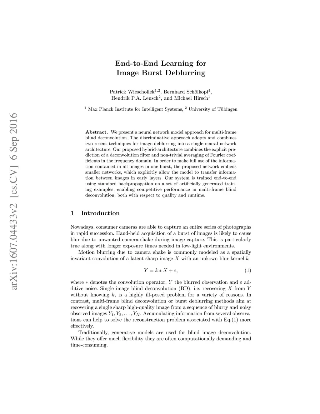 We present a neural network model approach for multi-frame blind deconvolution. The discriminative approach adopts and combines two recent techniques for image deblurring into a single neural network architecture. Our proposed hybrid-architecture combines the explicit prediction of a deconvolution filter and non-trivial averaging of Fourier coefficients in the frequency domain. In order to make full use of the information contained in all images in one burst, the proposed network embeds smaller networks, which explicitly allow the model to transfer information between images in early layers. Our system is trained end-to-end using standard backpropagation on a set of artificially generated training examples, enabling competitive performance in multi-frame blind deconvolution, both with respect to quality and runtime.