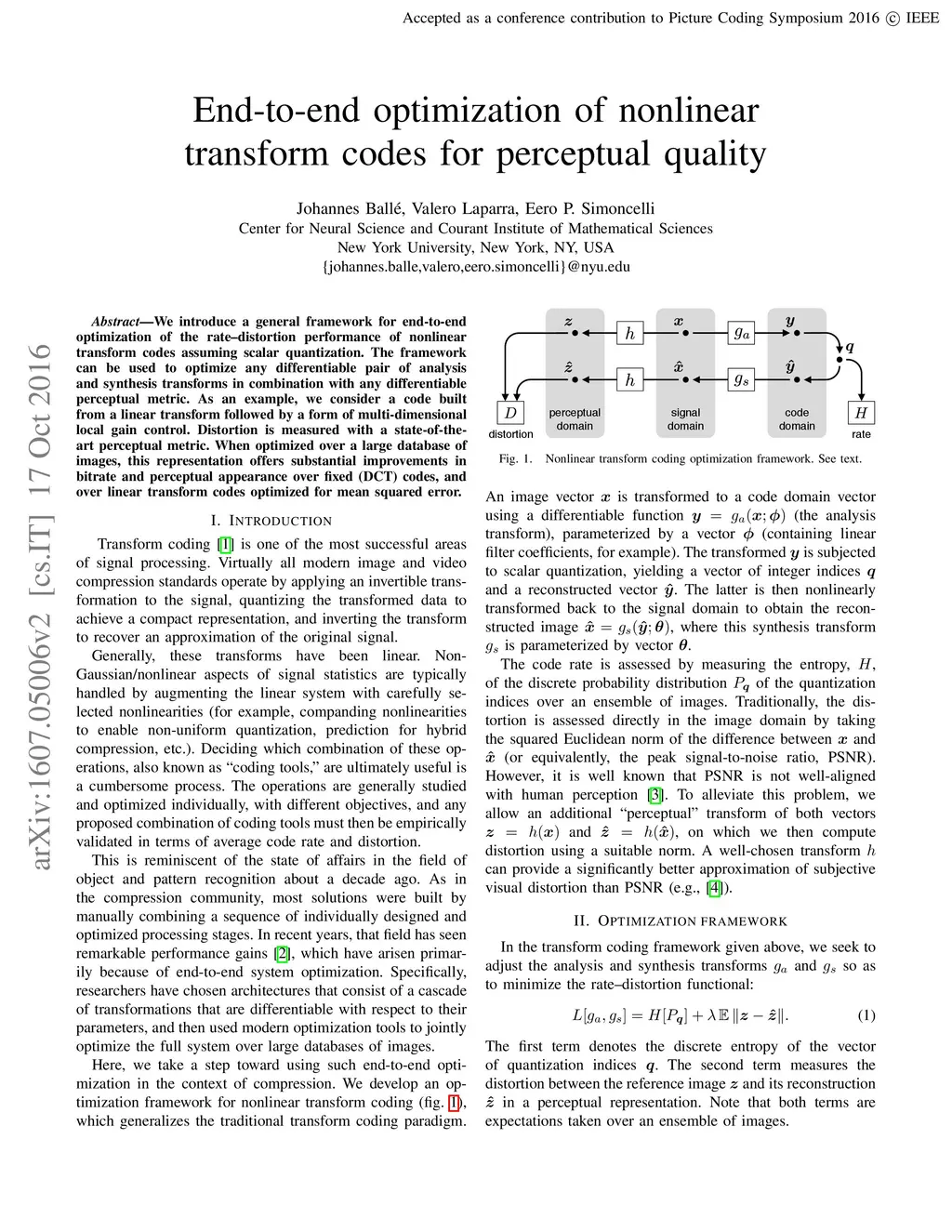 We introduce a general framework for end-to-end optimization of the rate--distortion performance of nonlinear transform codes assuming scalar quantization. The framework can be used to optimize any differentiable pair of analysis and synthesis transforms in combination with any differentiable perceptual metric. As an example, we consider a code built from a linear transform followed by a form of multi-dimensional local gain control. Distortion is measured with a state-of-the-art perceptual metric. When optimized over a large database of images, this representation offers substantial improvements in bitrate and perceptual appearance over fixed (DCT) codes, and over linear transform codes optimized for mean squared error.