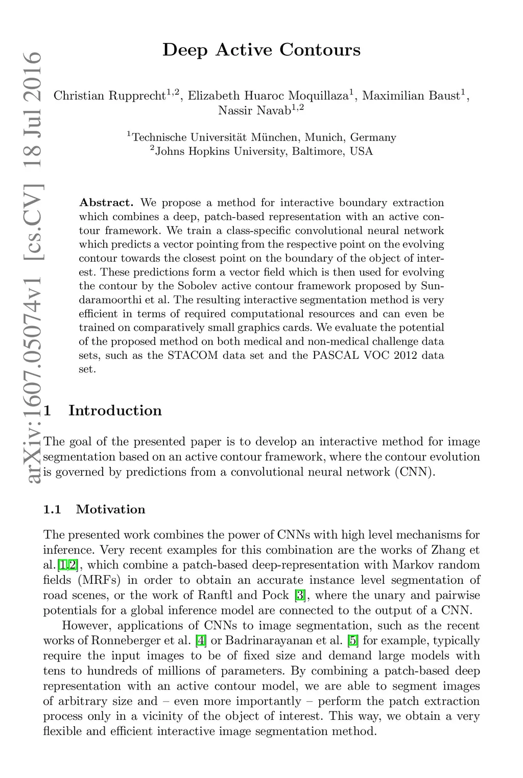 We propose a method for interactive boundary extraction which combines a deep, patch-based representation with an active contour framework. We train a class-specific convolutional neural network which predicts a vector pointing from the respective point on the evolving contour towards the closest point on the boundary of the object of interest. These predictions form a vector field which is then used for evolving the contour by the Sobolev active contour framework proposed by Sundaramoorthi et al. The resulting interactive segmentation method is very efficient in terms of required computational resources and can even be trained on comparatively small graphics cards. We evaluate the potential of the proposed method on both medical and non-medical challenge data sets, such as the STACOM data set and the PASCAL VOC 2012 data set.