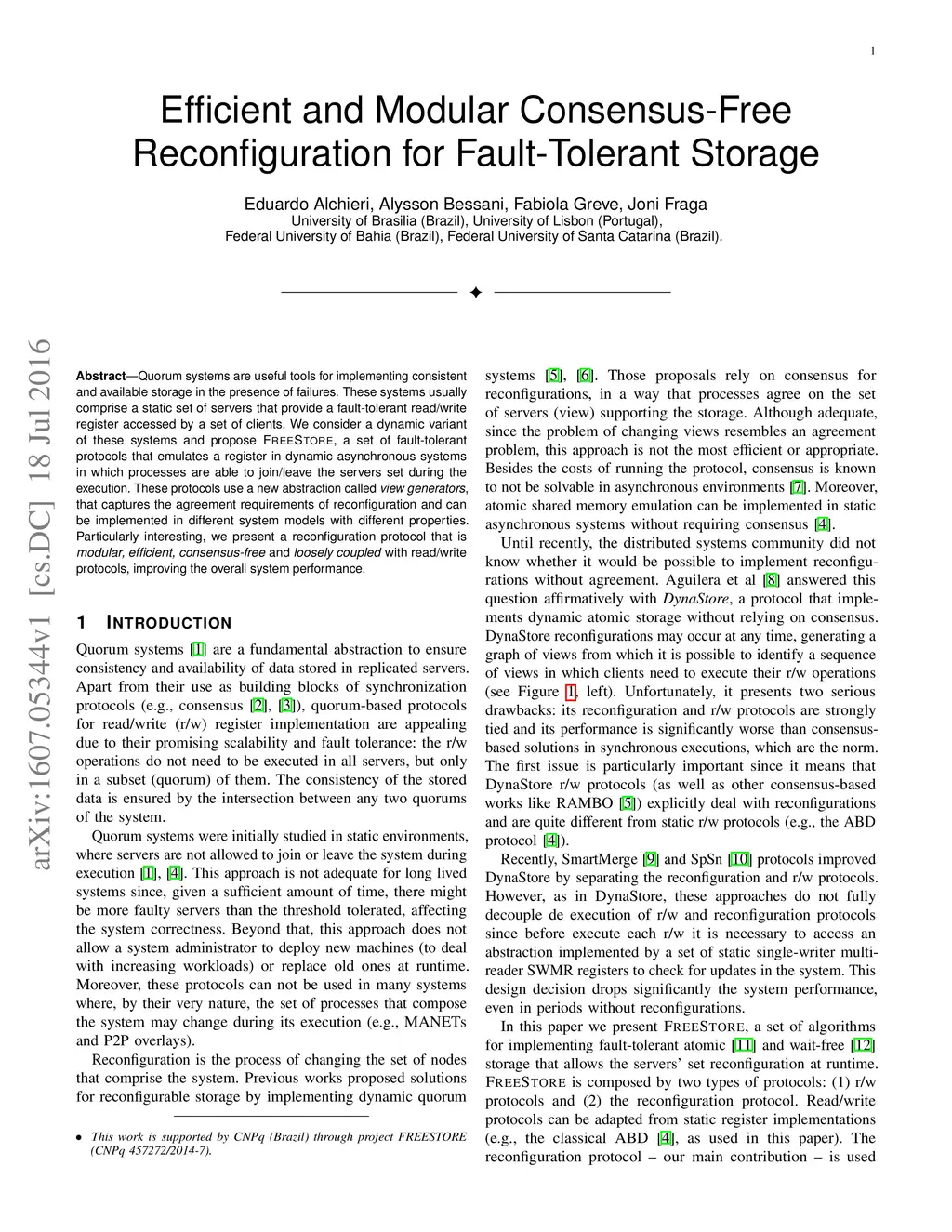 Quorum systems are useful tools for implementing consistent and available storage in the presence of failures. These systems usually comprise a static set of servers that provide a fault-tolerant read/write register accessed by a set of clients. We consider a dynamic variant of these systems and propose FreeStore, a set of fault-tolerant protocols that emulates a register in dynamic asynchronous systems in which processes are able to join/leave the servers set during the execution. These protocols use a new abstraction called view generators, that captures the agreement requirements of reconfiguration and can be implemented in different system models with different properties. Particularly interesting, we present a reconfiguration protocol that is modular, efficient, consensus-free and loosely coupled with read/write protocols, improving the overall system performance.