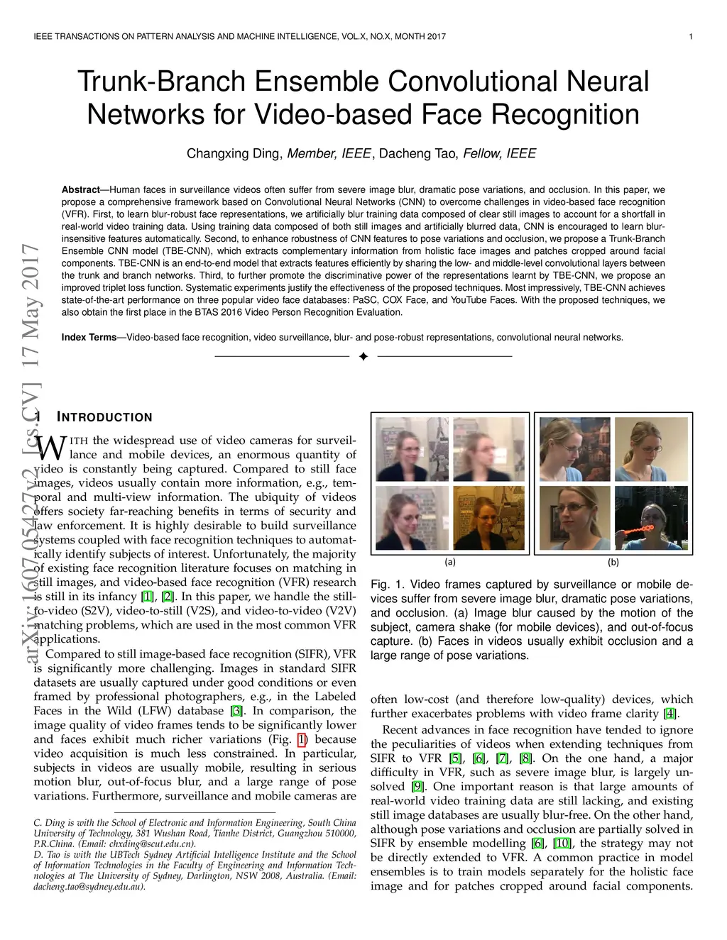 Human faces in surveillance videos often suffer from severe image blur, dramatic pose variations, and occlusion. In this paper, we propose a comprehensive framework based on Convolutional Neural Networks (CNN) to overcome challenges in video-based face recognition (VFR). First, to learn blur-robust face representations, we artificially blur training data composed of clear still images to account for a shortfall in real-world video training data. Using training data composed of both still images and artificially blurred data, CNN is encouraged to learn blur-insensitive features automatically. Second, to enhance robustness of CNN features to pose variations and occlusion, we propose a Trunk-Branch Ensemble CNN model (TBE-CNN), which extracts complementary information from holistic face images and patches cropped around facial components. TBE-CNN is an end-to-end model that extracts features efficiently by sharing the low- and middle-level convolutional layers between the trunk and branch networks. Third, to further promote the discriminative power of the representations learnt by TBE-CNN, we propose an improved triplet loss function. Systematic experiments justify the effectiveness of the proposed techniques. Most impressively, TBE-CNN achieves state-of-the-art performance on three popular video face databases: PaSC, COX Face, and YouTube Faces. With the proposed techniques, we also obtain the first place in the BTAS 2016 Video Person Recognition Evaluation.
