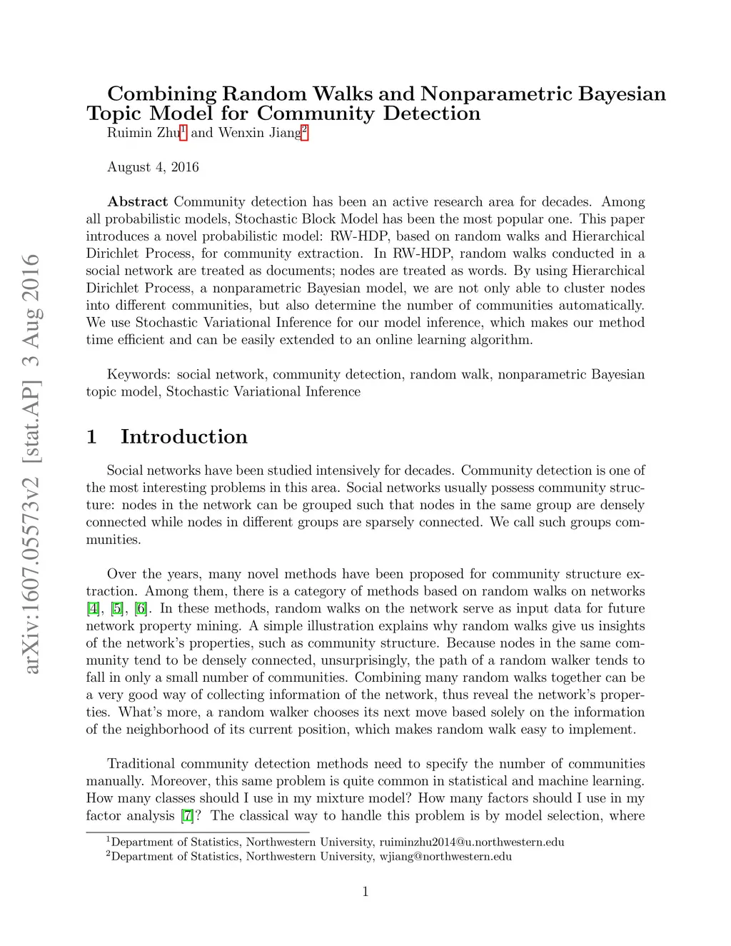 Community detection has been an active research area for decades. Among all probabilistic models, Stochastic Block Model has been the most popular one. This paper introduces a novel probabilistic model: RW-HDP, based on random walks and Hierarchical Dirichlet Process, for community extraction. In RW-HDP, random walks conducted in a social network are treated as documents; nodes are treated as words. By using Hierarchical Dirichlet Process, a nonparametric Bayesian model, we are not only able to cluster nodes into different communities, but also determine the number of communities automatically. We use Stochastic Variational Inference for our model inference, which makes our method time efficient and can be easily extended to an online learning algorithm.