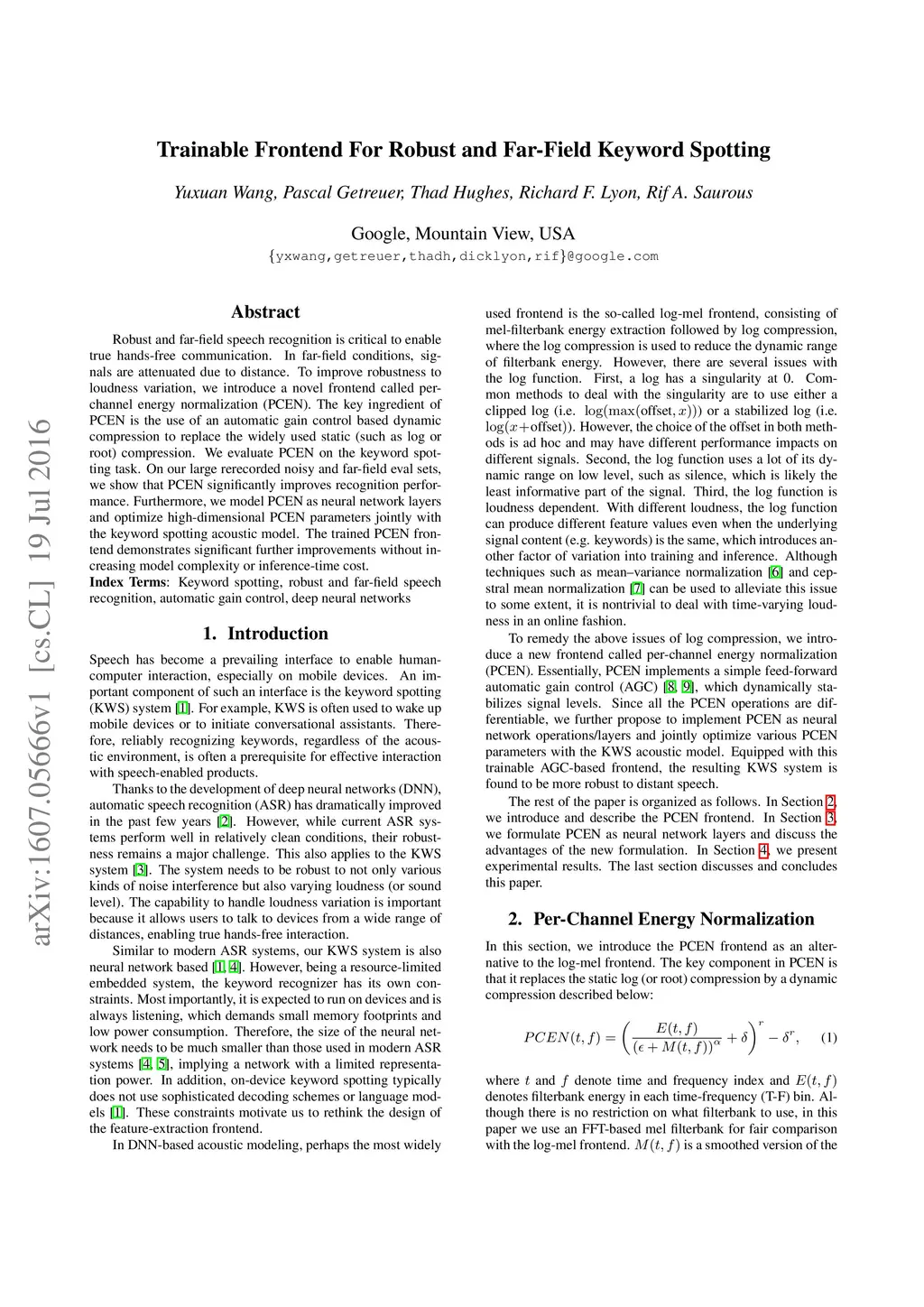 Robust and far-field speech recognition is critical to enable true hands-free communication. In far-field conditions, signals are attenuated due to distance. To improve robustness to loudness variation, we introduce a novel frontend called per-channel energy normalization (PCEN). The key ingredient of PCEN is the use of an automatic gain control based dynamic compression to replace the widely used static (such as log or root) compression. We evaluate PCEN on the keyword spotting task. On our large rerecorded noisy and far-field eval sets, we show that PCEN significantly improves recognition performance. Furthermore, we model PCEN as neural network layers and optimize high-dimensional PCEN parameters jointly with the keyword spotting acoustic model. The trained PCEN frontend demonstrates significant further improvements without increasing model complexity or inference-time cost.