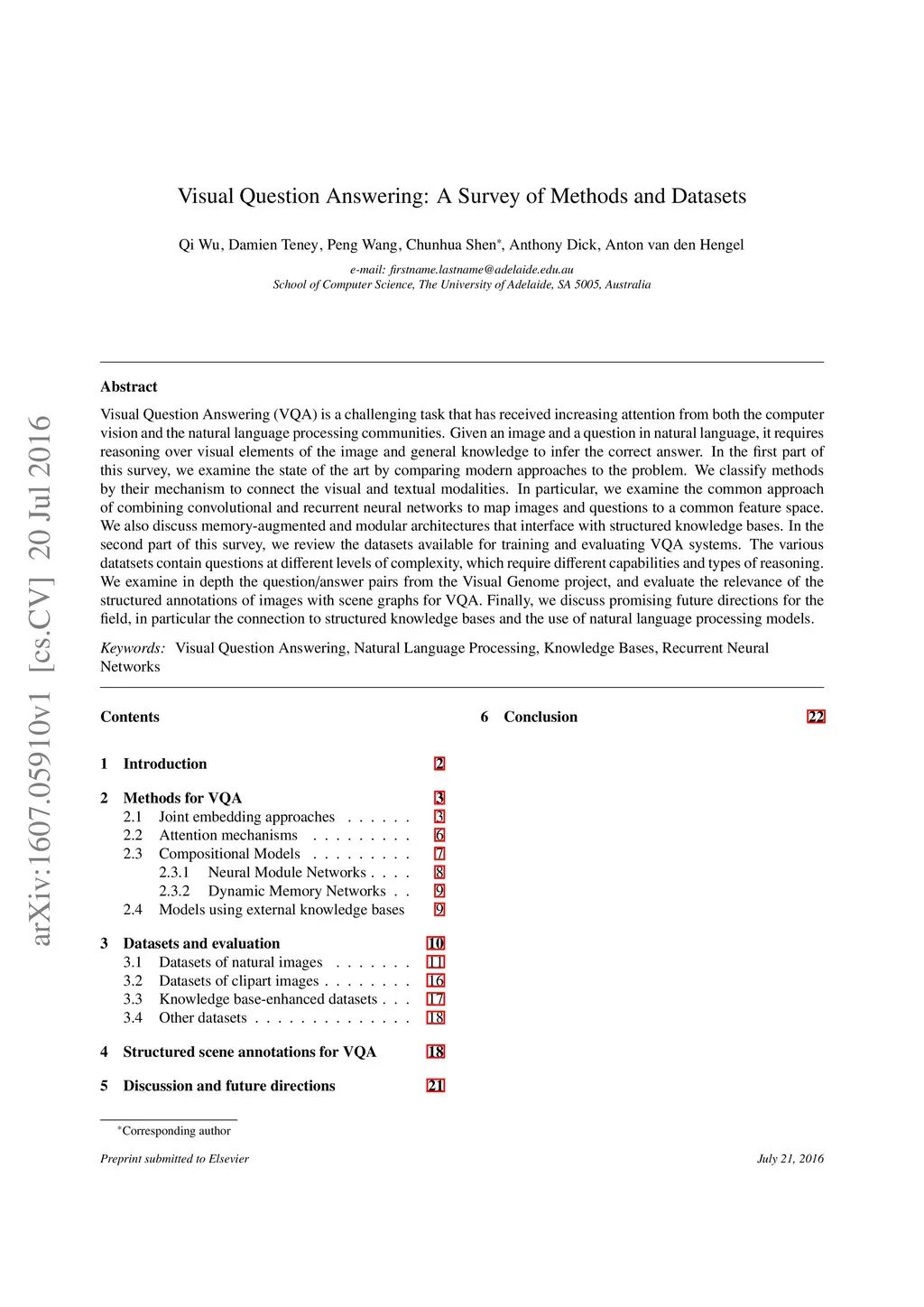 Visual Question Answering (VQA) is a challenging task that has received increasing attention from both the computer vision and the natural language processing communities. Given an image and a question in natural language, it requires reasoning over visual elements of the image and general knowledge to infer the correct answer. In the first part of this survey, we examine the state of the art by comparing modern approaches to the problem. We classify methods by their mechanism to connect the visual and textual modalities. In particular, we examine the common approach of combining convolutional and recurrent neural networks to map images and questions to a common feature space. We also discuss memory-augmented and modular architectures that interface with structured knowledge bases. In the second part of this survey, we review the datasets available for training and evaluating VQA systems. The various datatsets contain questions at different levels of complexity, which require different capabilities and types of reasoning. We examine in depth the question/answer pairs from the Visual Genome project, and evaluate the relevance of the structured annotations of images with scene graphs for VQA. Finally, we discuss promising future directions for the field, in particular the connection to structured knowledge bases and the use of natural language processing models.