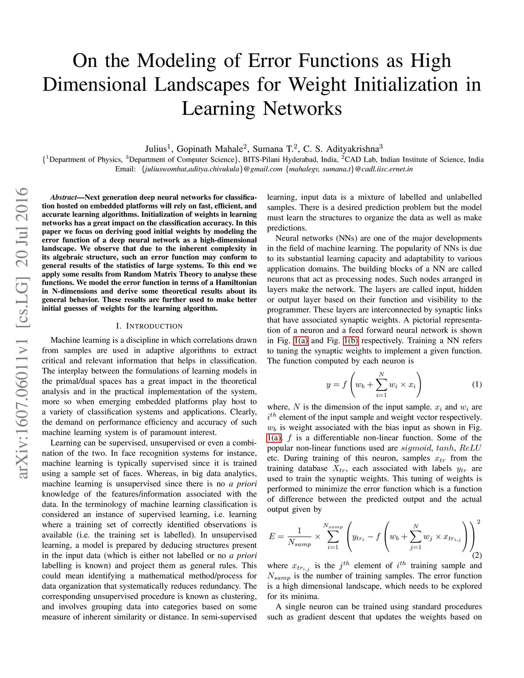 Next generation deep neural networks for classification hosted on embedded platforms will rely on fast, efficient, and accurate learning algorithms. Initialization of weights in learning networks has a great impact on the classification accuracy. In this paper we focus on deriving good initial weights by modeling the error function of a deep neural network as a high-dimensional landscape. We observe that due to the inherent complexity in its algebraic structure, such an error function may conform to general results of the statistics of large systems. To this end we apply some results from Random Matrix Theory to analyse these functions. We model the error function in terms of a Hamiltonian in N-dimensions and derive some theoretical results about its general behavior. These results are further used to make better initial guesses of weights for the learning algorithm.