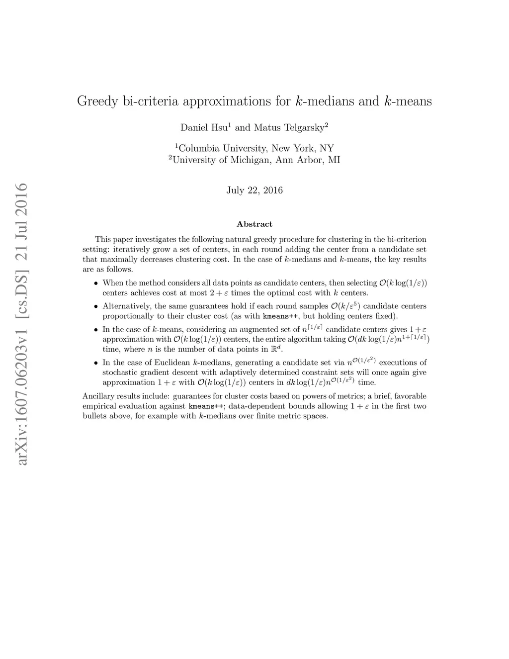 This paper investigates the following natural greedy procedure for clustering in the bi-criterion setting: iteratively grow a set of centers, in each round adding the center from a candidate set that maximally decreases clustering cost. In the case of -medians and -means, the key results are as follows. When the method considers all data points as candidate centers, then selecting centers achieves cost at most times the optimal cost with centers. Alternatively, the same guarantees hold if each round samples candidate centers proportionally to their cluster cost (as with , but holding centers fixed). In the case of -means, considering an augmented set of candidate centers gives approximation with centers, the entire algorithm taking time, where is the number of data points in . In the case of Euclidean -medians, generating a candidate set via executions of stochastic gradient descent with adaptively determined constraint sets will once again give approximation with centers in time. Ancillary results include: guarantees for cluster costs based on powers of metrics; a brief, favorable empirical evaluation against ; data-dependent bounds allowing in the first two bullets above, for example with -medians over finite metric spaces.