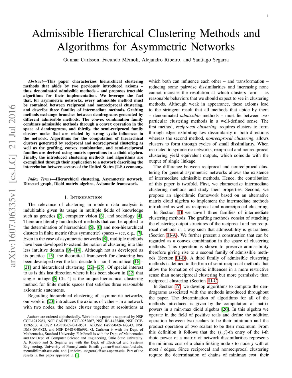This paper characterizes hierarchical clustering methods that abide by two previously introduced axioms -- thus, denominated admissible methods -- and proposes tractable algorithms for their implementation. We leverage the fact that, for asymmetric networks, every admissible method must be contained between reciprocal and nonreciprocal clustering, and describe three families of intermediate methods. Grafting methods exchange branches between dendrograms generated by different admissible methods. The convex combination family combines admissible methods through a convex operation in the space of dendrograms, and thirdly, the semi-reciprocal family clusters nodes that are related by strong cyclic influences in the network. Algorithms for the computation of hierarchical clusters generated by reciprocal and nonreciprocal clustering as well as the grafting, convex combination, and semi-reciprocal families are derived using matrix operations in a dioid algebra. Finally, the introduced clustering methods and algorithms are exemplified through their application to a network describing the interrelation between sectors of the United States (U.S.) economy.