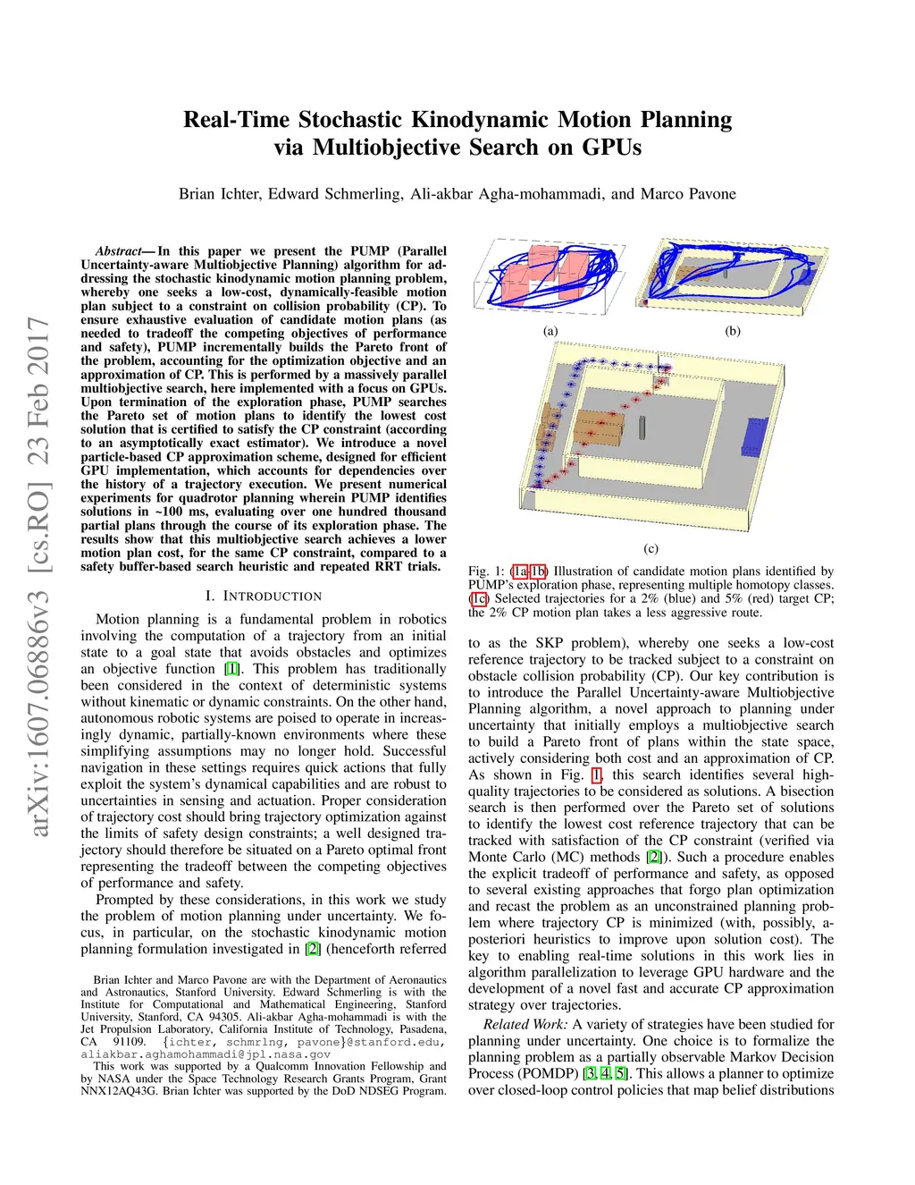 In this paper we present the PUMP (Parallel Uncertainty-aware Multiobjective Planning) algorithm for addressing the stochastic kinodynamic motion planning problem, whereby one seeks a low-cost, dynamically-feasible motion plan subject to a constraint on collision probability (CP). To ensure exhaustive evaluation of candidate motion plans (as needed to tradeoff the competing objectives of performance and safety), PUMP incrementally builds the Pareto front of the problem, accounting for the optimization objective and an approximation of CP. This is performed by a massively parallel multiobjective search, here implemented with a focus on GPUs. Upon termination of the exploration phase, PUMP searches the Pareto set of motion plans to identify the lowest cost solution that is certified to satisfy the CP constraint (according to an asymptotically exact estimator). We introduce a novel particle-based CP approximation scheme, designed for efficient GPU implementation, which accounts for dependencies over the history of a trajectory execution. We present numerical experiments for quadrotor planning wherein PUMP identifies solutions in ~100 ms, evaluating over one hundred thousand partial plans through the course of its exploration phase. The results show that this multiobjective search achieves a lower motion plan cost, for the same CP constraint, compared to a safety buffer-based search heuristic and repeated RRT trials.